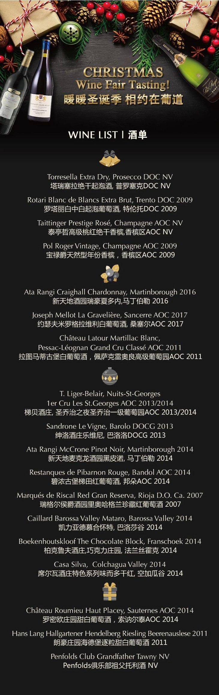 今年,葡道圣诞节提前趴,传统圣诞火腿加上华丽酒单,香槟、气泡,列级波尔多、意式巴罗洛、西班牙里奥哈、新西兰产区之星, 南非巧克力庄园,智利白银酒庄小维戈,德国逐粒精选等或经典或个性的美味臻酿,应有尽有。