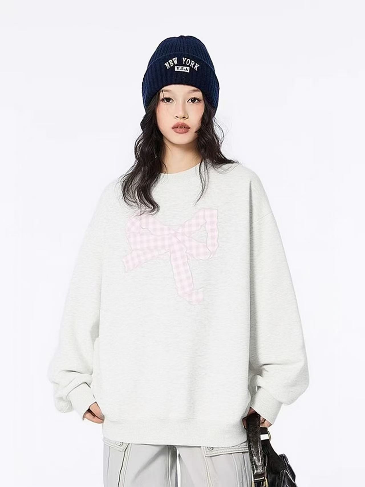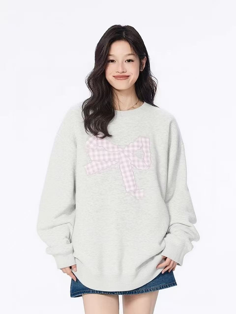 🔥🔥【潮牌卫衣】圆领牛奶绒~格子粉蝴蝶结宽松加绒卫衣-喜出