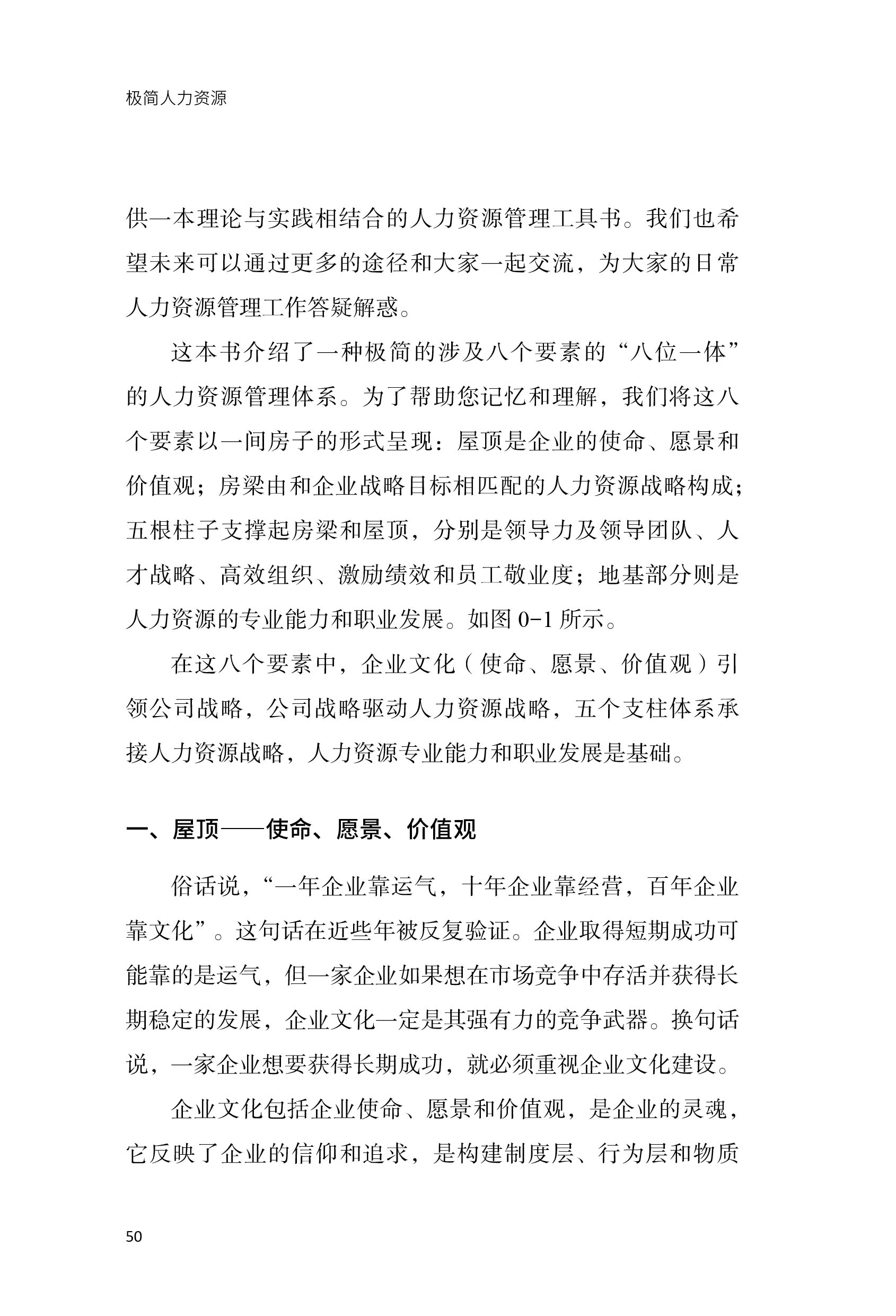 本书用 “极简” 的理念回归人力资源管理的本质和核心,力读者提供了一种完整的 “八位一体” 的人力资源管理体系,不仅涵盖了企业文化、人力资源战略、组织效能、绩效激励、人才培养、人力资源职业发展等人力资源管理关键环节,还将复杂的人力资源管理理论简化易于理解和操作的实践指南,帮助企业根据战略发展需要建立起一套行之有效、机制健全、具备前瞻性的人力资源管理体系。