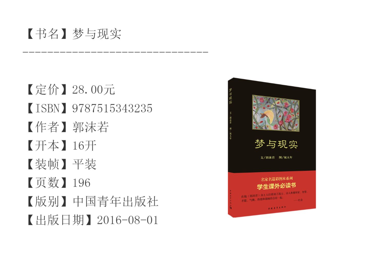黑皮书 梦与现实 郭沫若著祝大年彩插图中国青年出版社 小学四年级课外阅读推荐书目散文随笔 正品直发