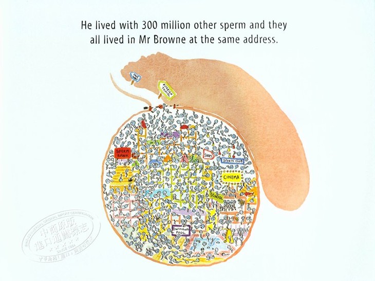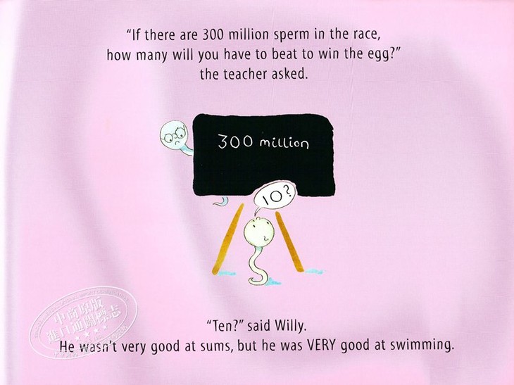 书中那位数学不好,但很会游泳的主角小威,在赢得了冠军大赛之后,却消失了,而肚子一天一天变大的布朗太太却生下一个数学不好,也很会游泳的小娜,这其中有趣的关联,令人玩味。除此之外,这本图画书将大人难以启齿的性教育话题,以简单的水彩画风表现出来,再加上小威戴着蛙镜的可爱造型、小精子居住的街道图,甚至是布朗先生的身体地图,都让人感受到画者营造的幽默风格。