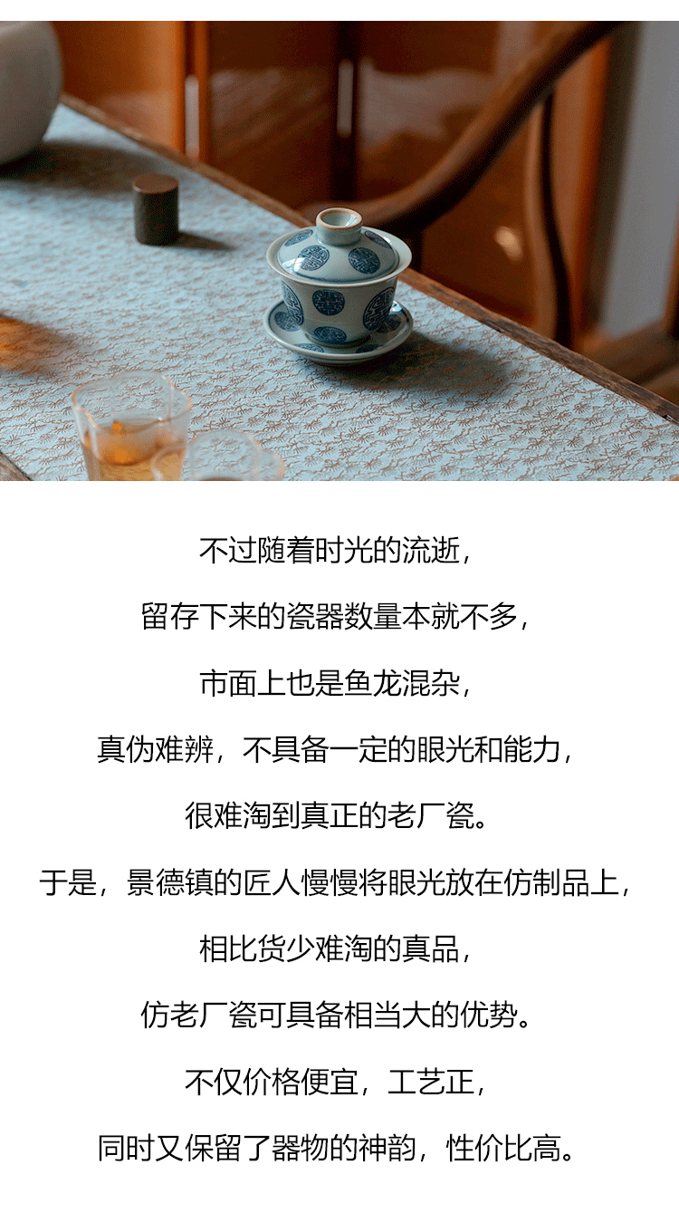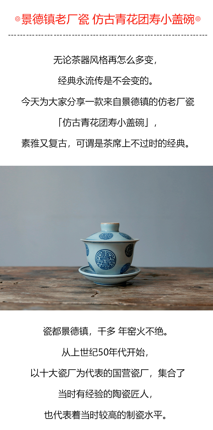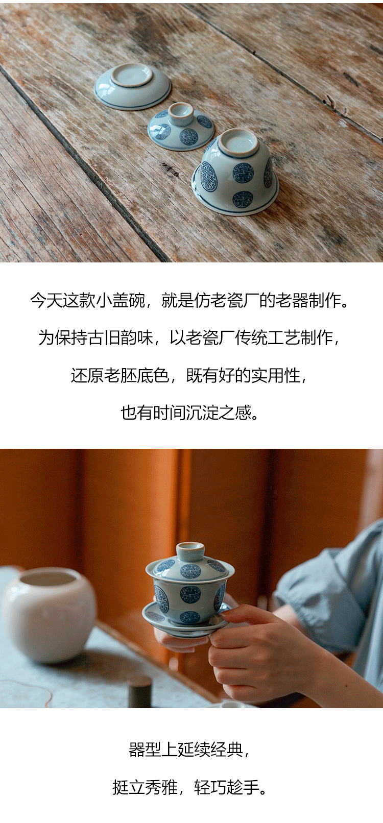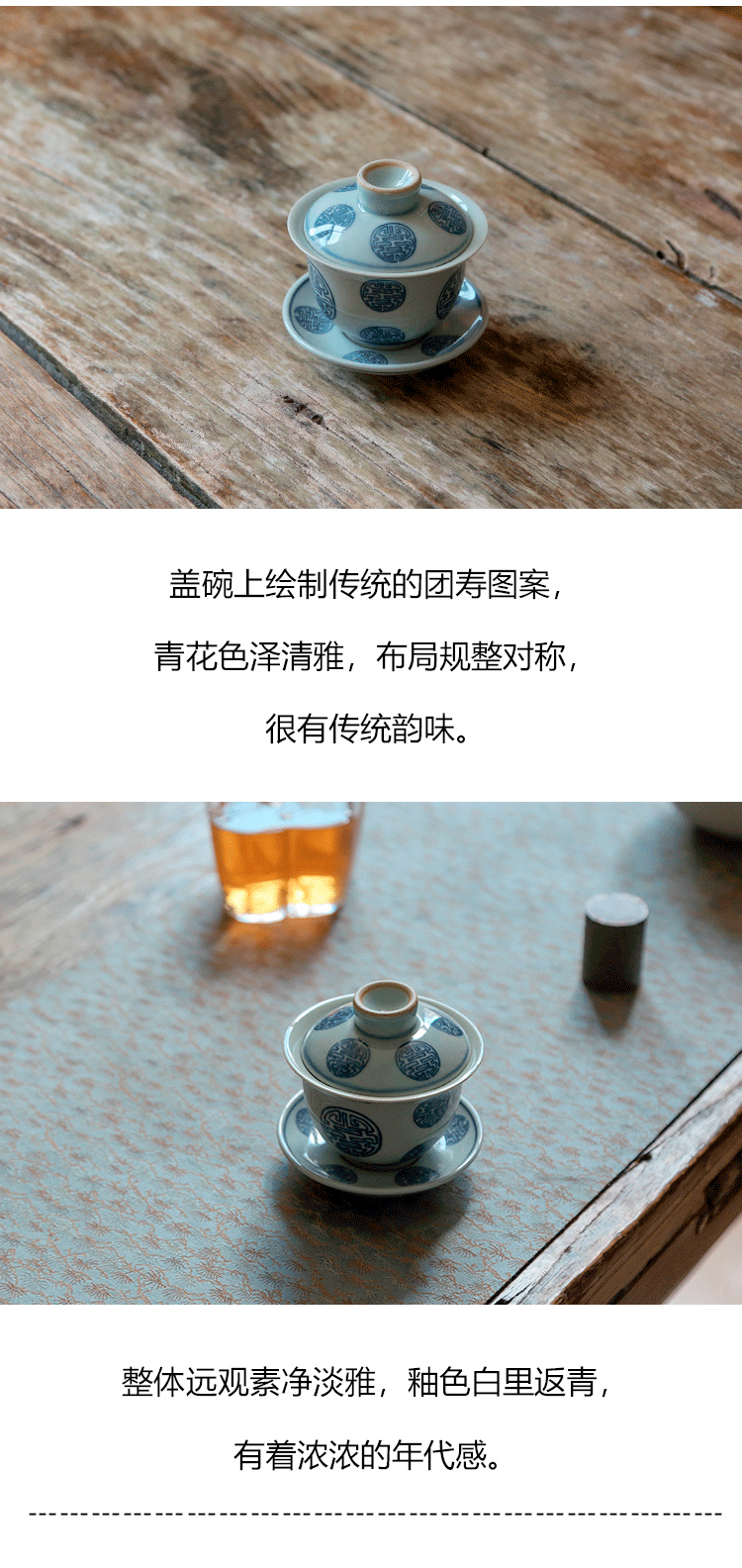 茶香记 景德镇老厂瓷 仿古青花团寿小盖碗 仿古老器 经典团寿纹 轻巧趁手 百搭不厌