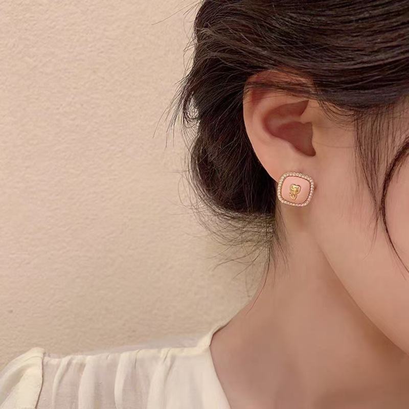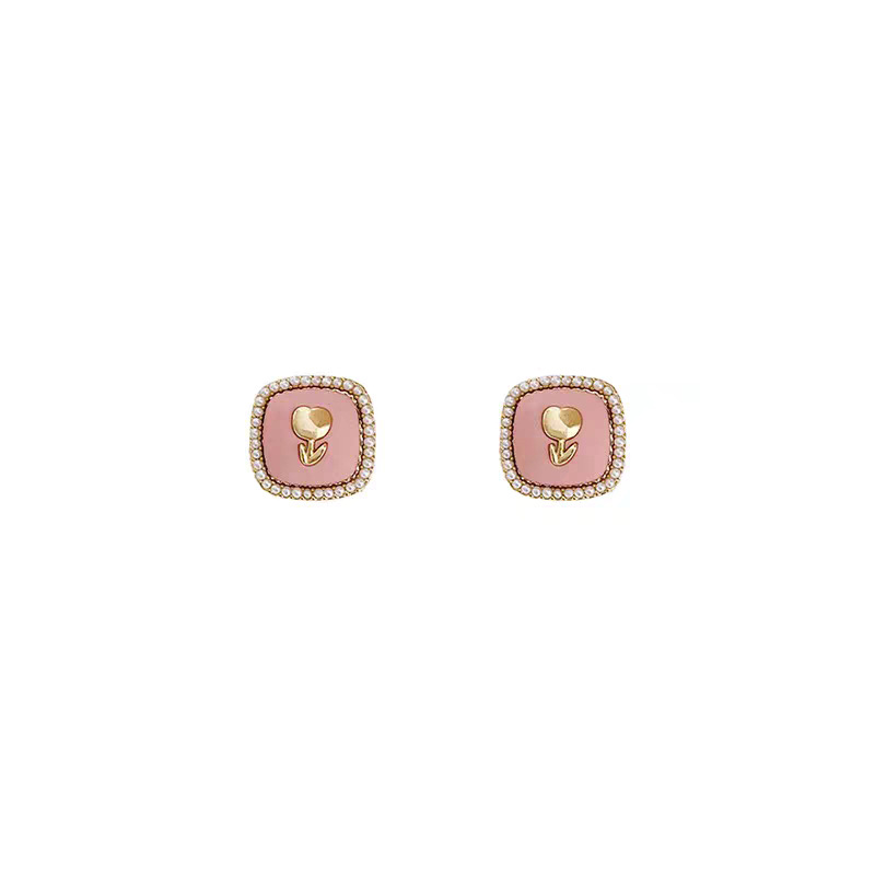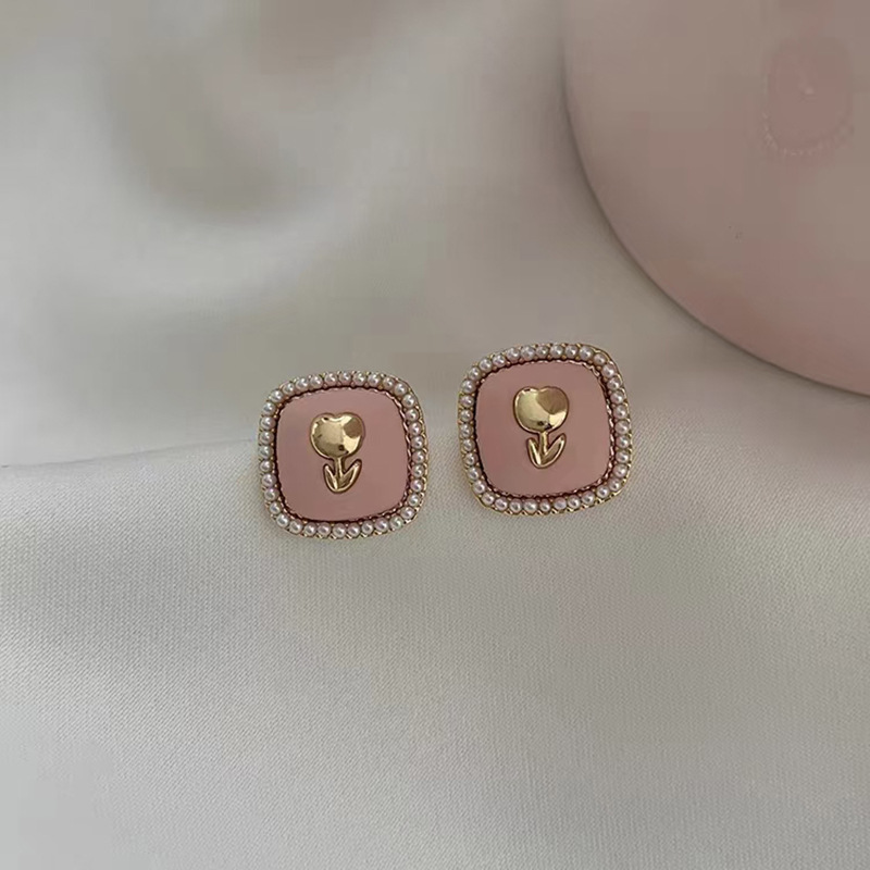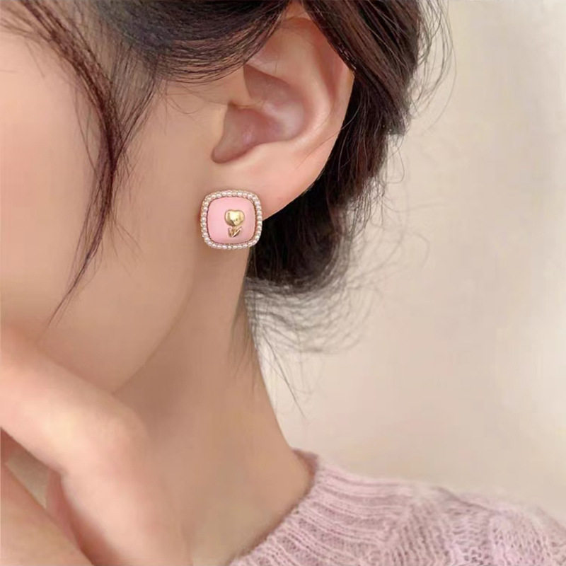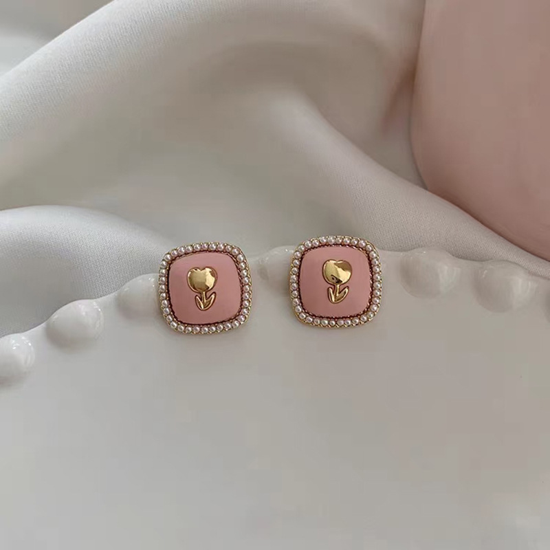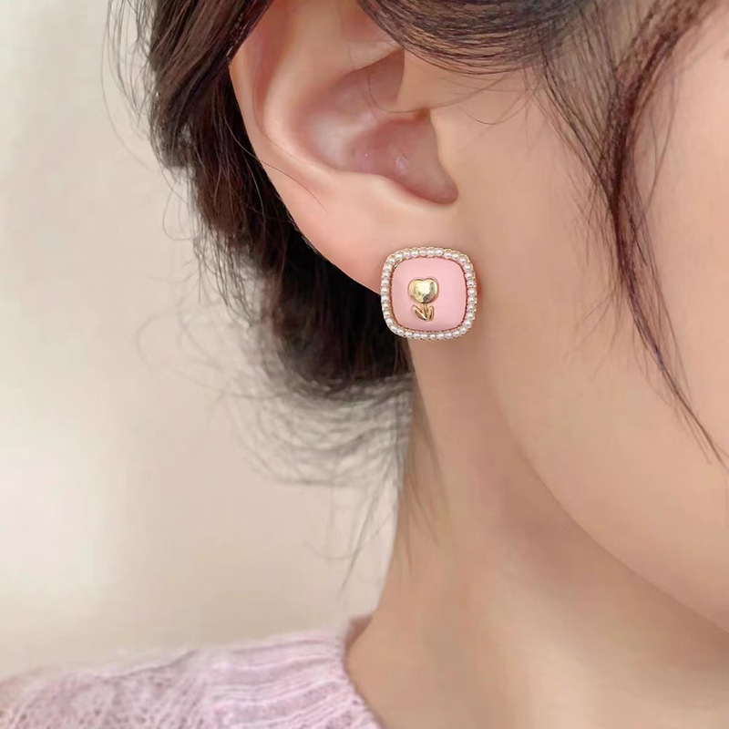 JU-C0029几何方形新款珍珠耳钉女小众感郁金香耳环潮甜美粉色耳饰