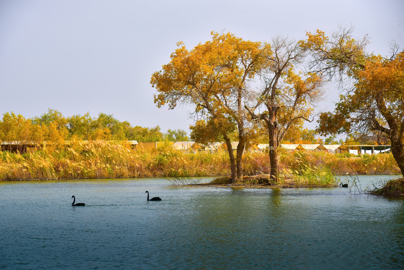 3、罗布人村寨水韵胡杨:藏着 “野趣与灵动”,海子环绕的胡杨根系虬曲外露,水波晃动让树影碎成鎏金碎片,搭配远处的罗布人民居,是人文与自然共生的鲜活画卷。
