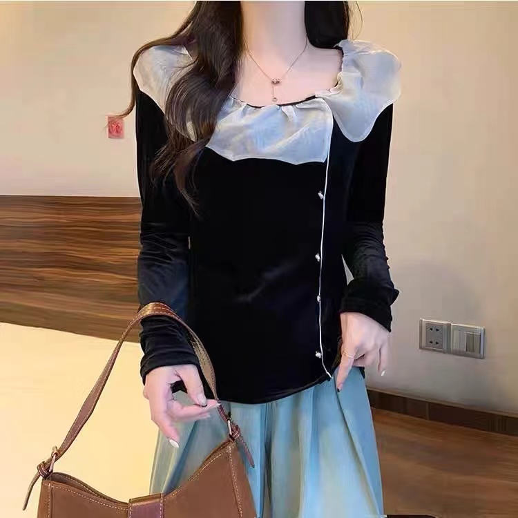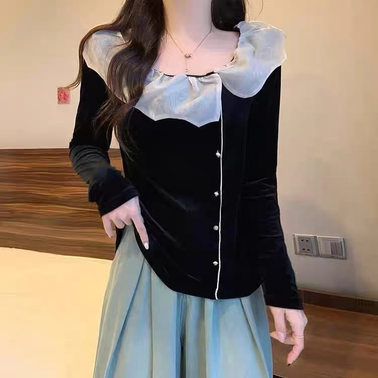 好看的哦~5112金丝绒拼网纱领小衫上衣-喜出
