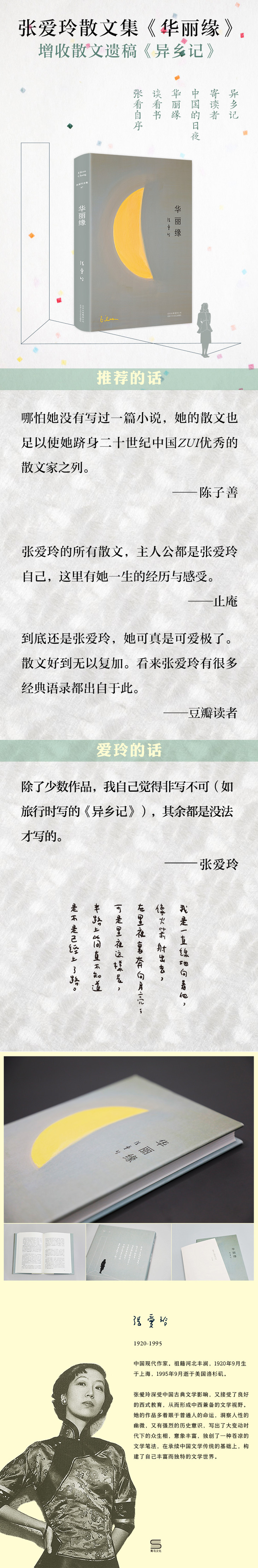 ·张爱玲散文集《华丽缘》,增收散文遗稿《异乡记》。全新精装,臻美典藏,月亮构筑起的永恒传奇。