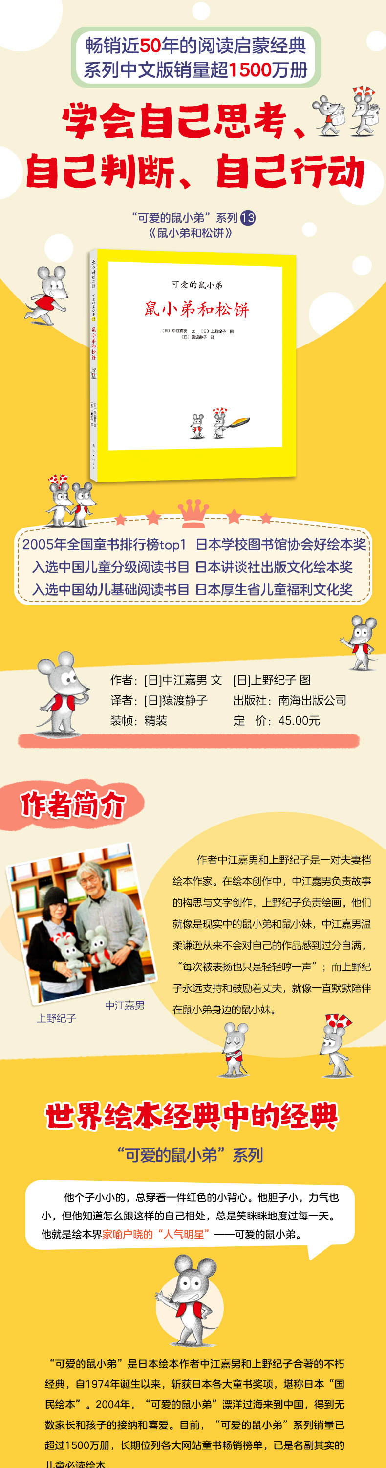 “可爱的鼠小弟”系列是日本绘本作者中江嘉男和上野纪子合著的不朽经典,自1974年诞生以来,斩获日本各大童书奖项——日本学校图书馆协会好绘本奖、日本产经儿童出版文化奖、日本讲谈社出版文化绘本奖、日本厚生省儿童福利文化奖,堪称日本“国民绘本”。