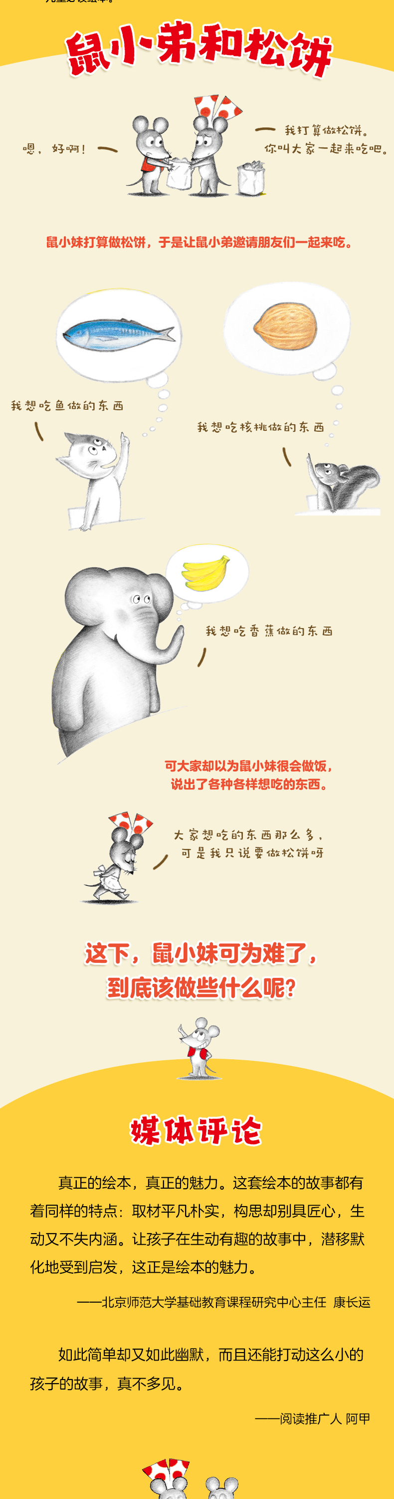 鼠小妹打算做松饼,于是让鼠小弟邀请朋友们一起来吃。可大家却以为鼠小妹很会做饭,说出了各种各样想吃的东西。这下,鼠小妹可为难了,到底该做些什么呢?