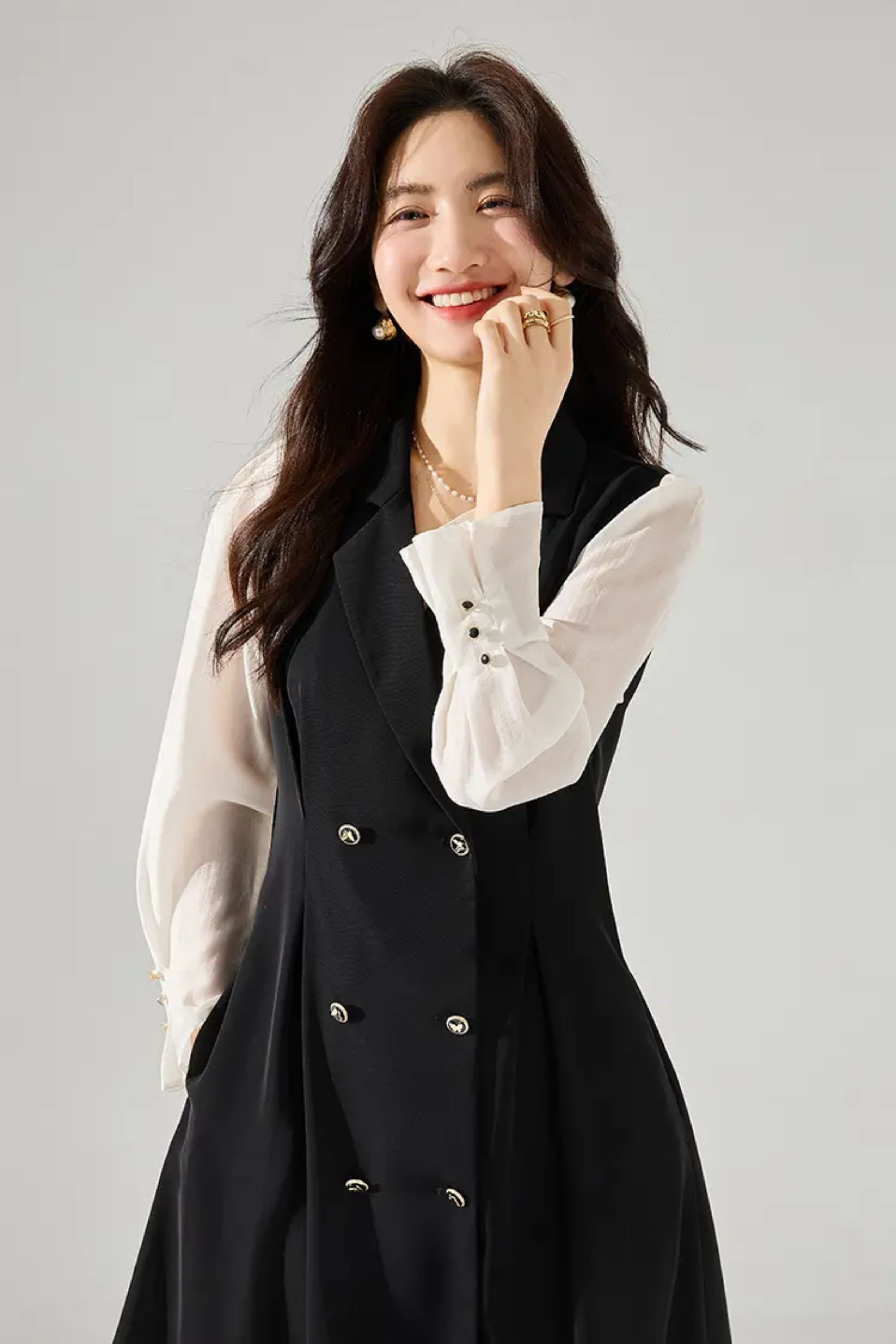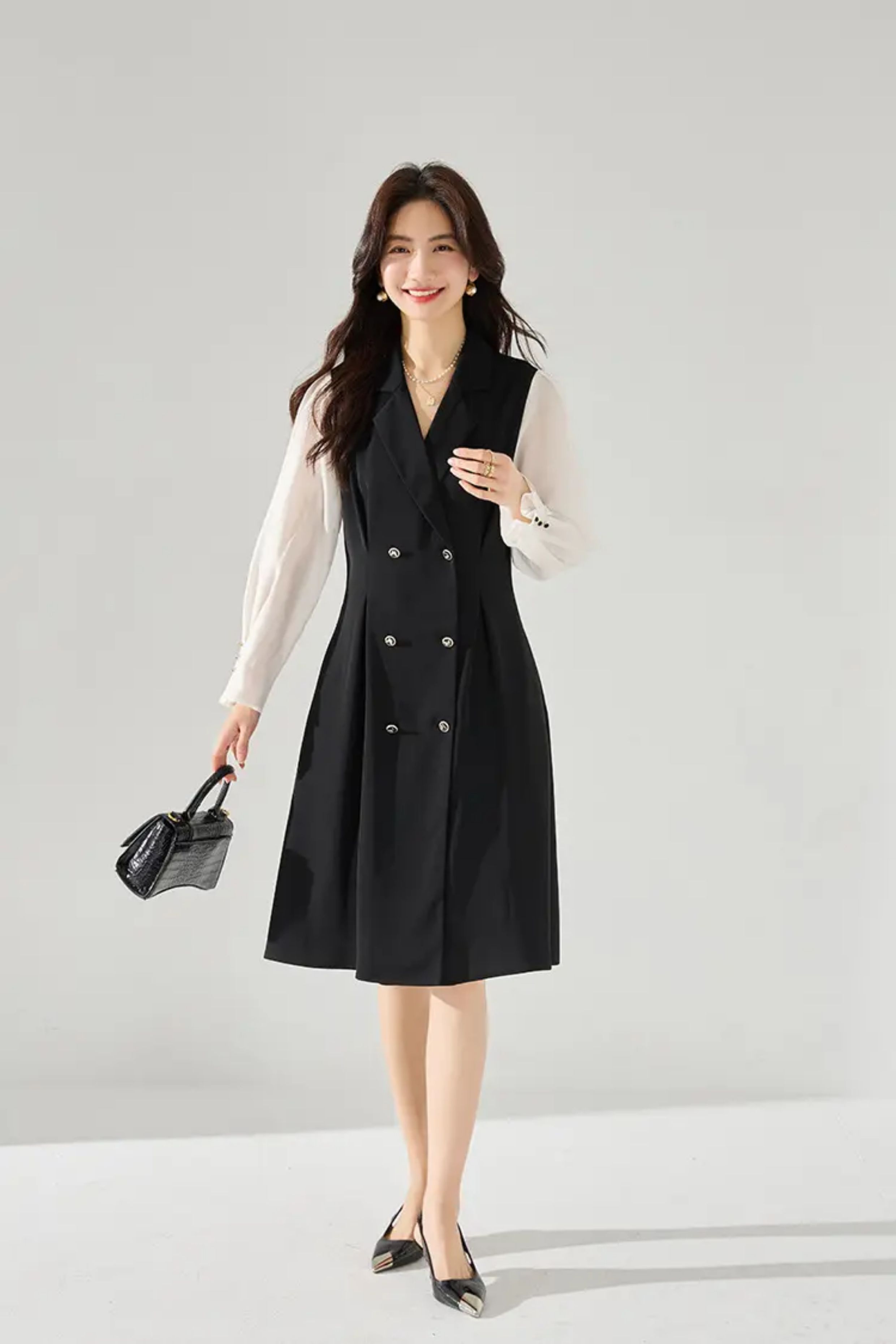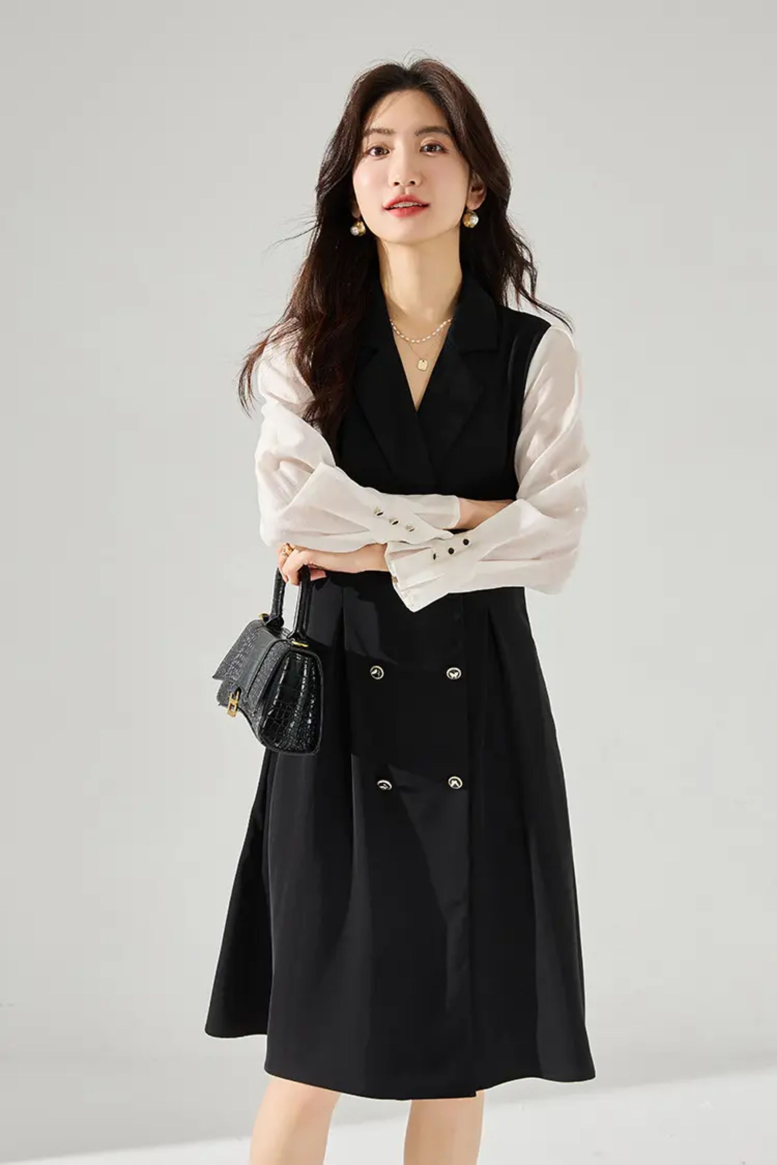 【高货sh】全新升级【铂金会员358/天猫479/差价121】(04853) 洛诗琳春季黑色西装领拼接收腰法式气质通勤中长款连衣裙