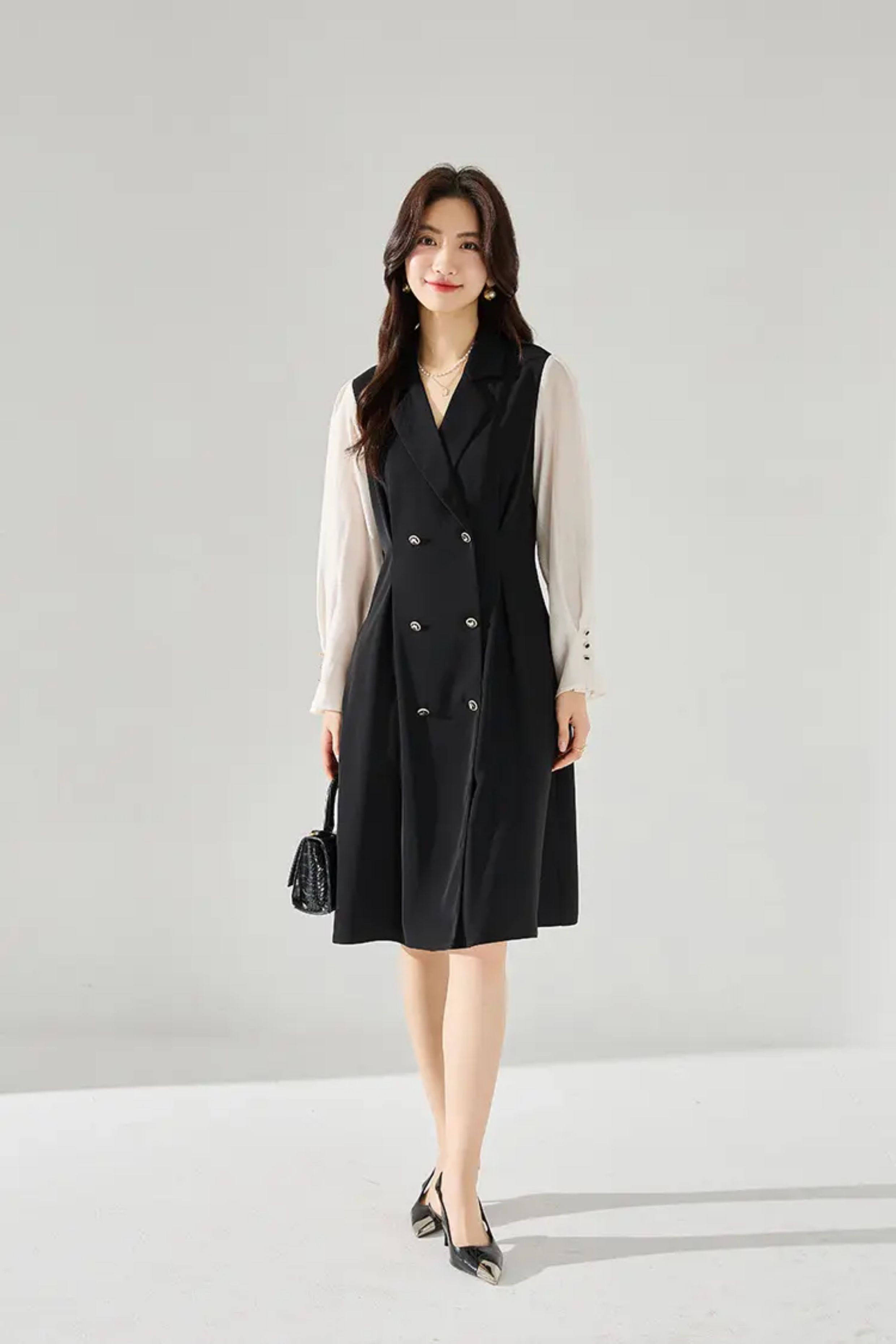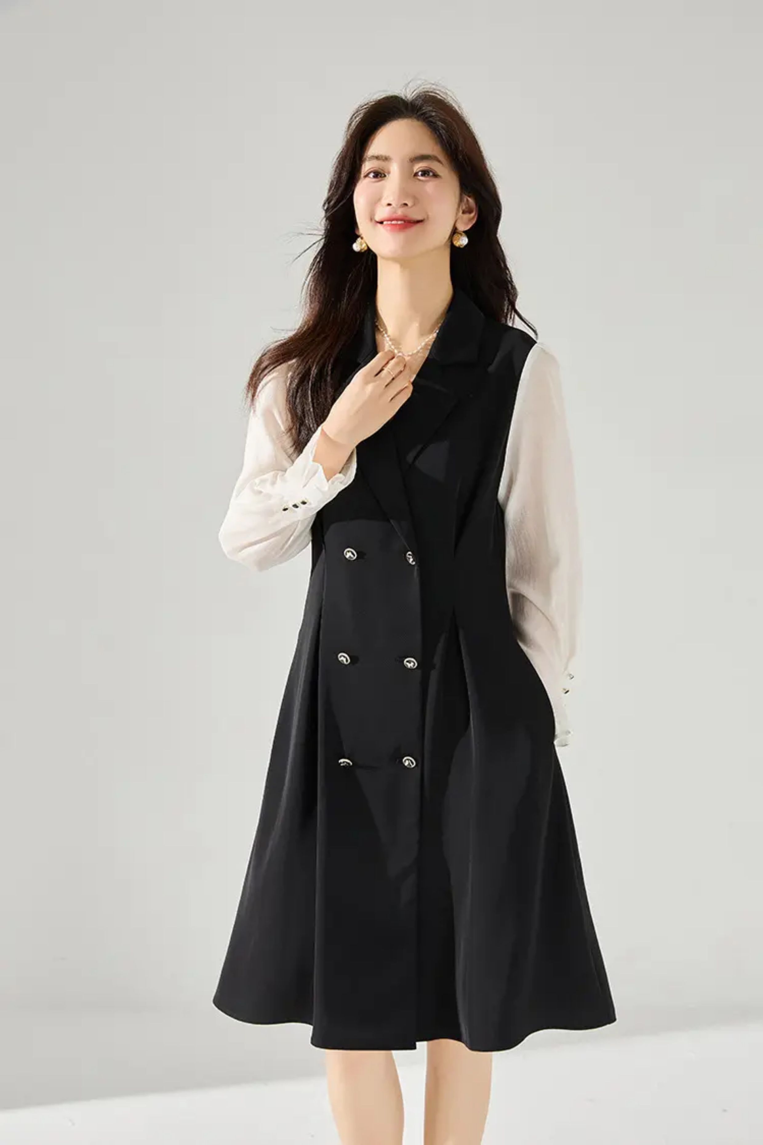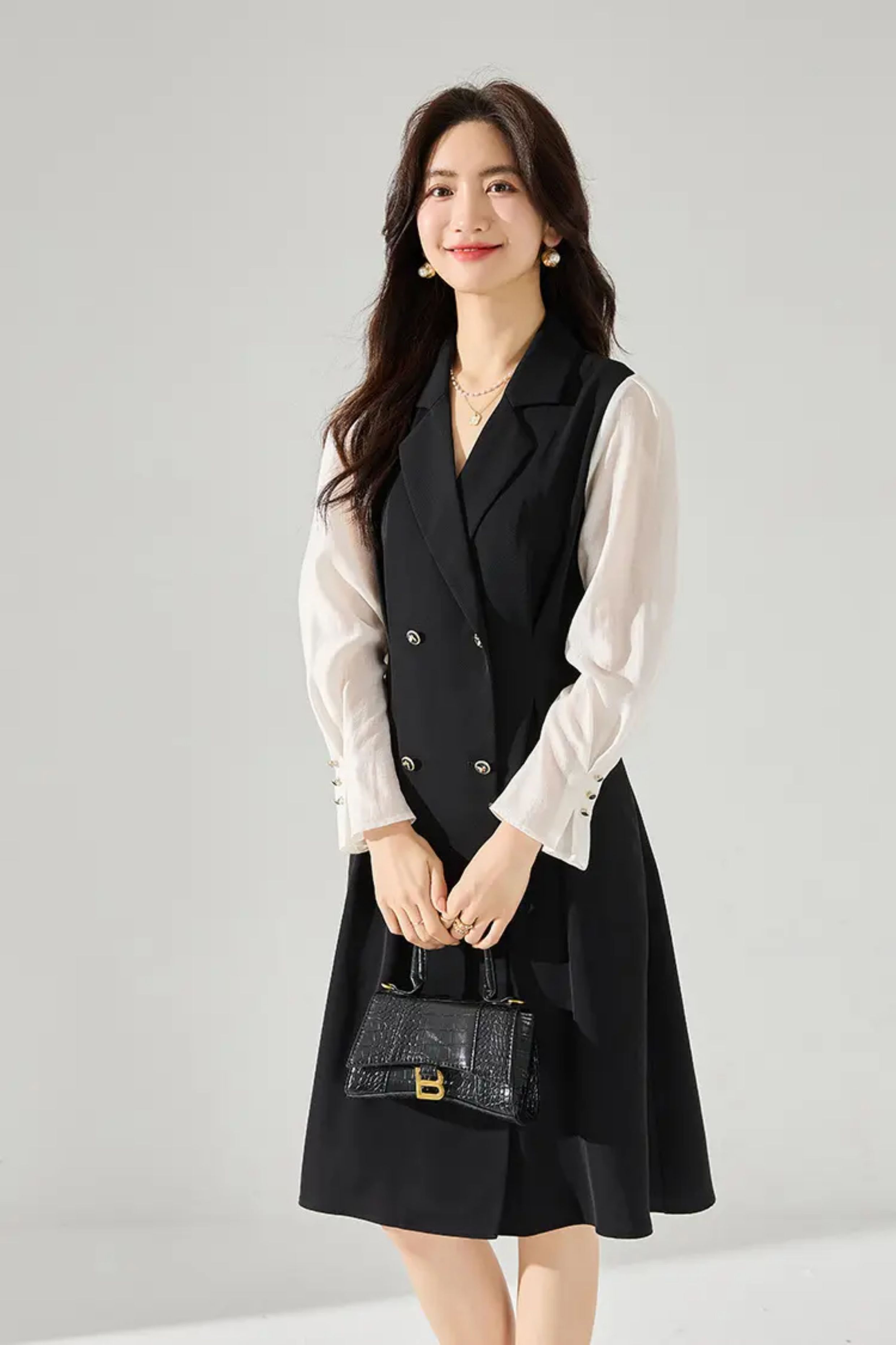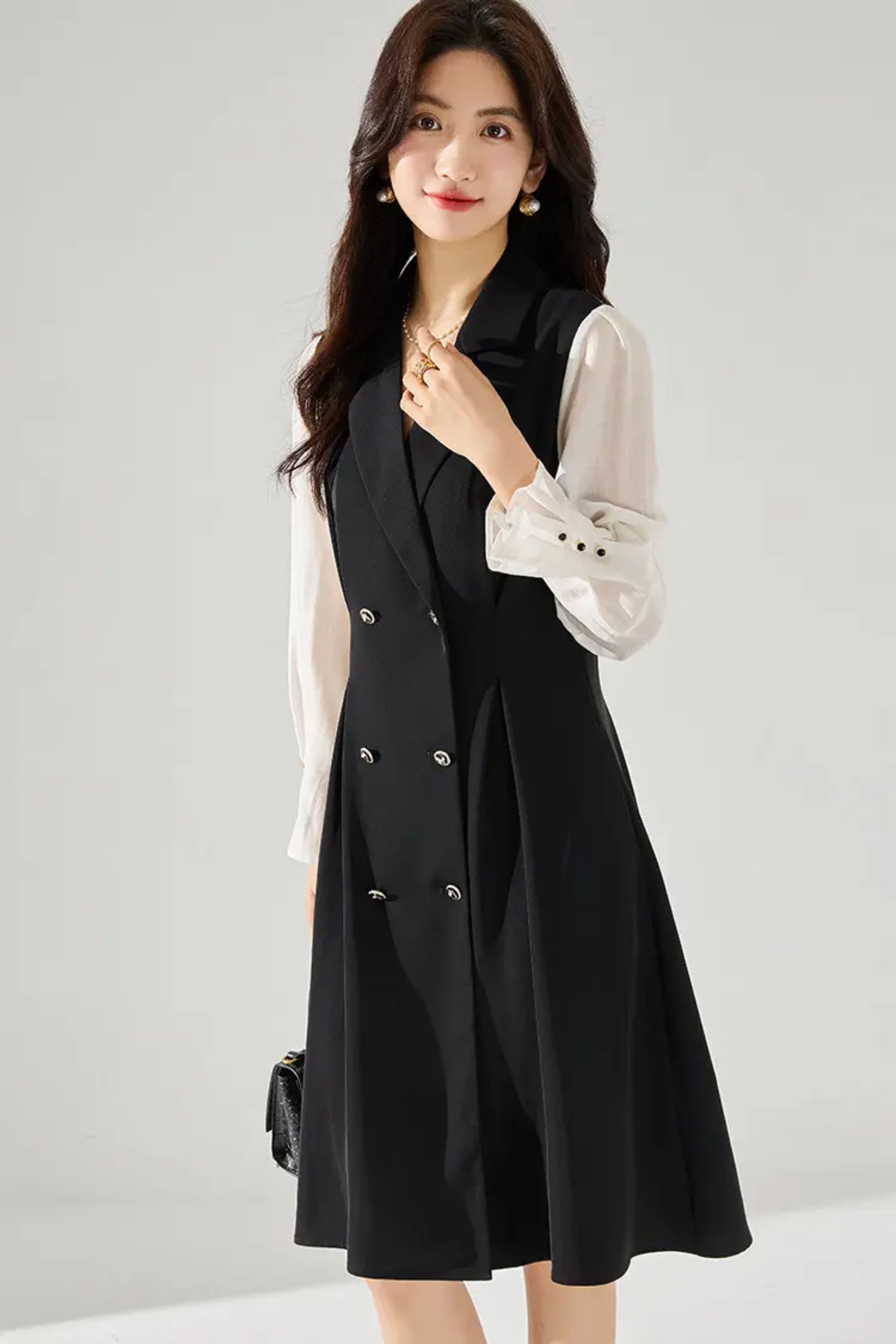 【高货sh】全新升级【铂金会员358/天猫479/差价121】(04853) 洛诗琳春季黑色西装领拼接收腰法式气质通勤中长款连衣裙