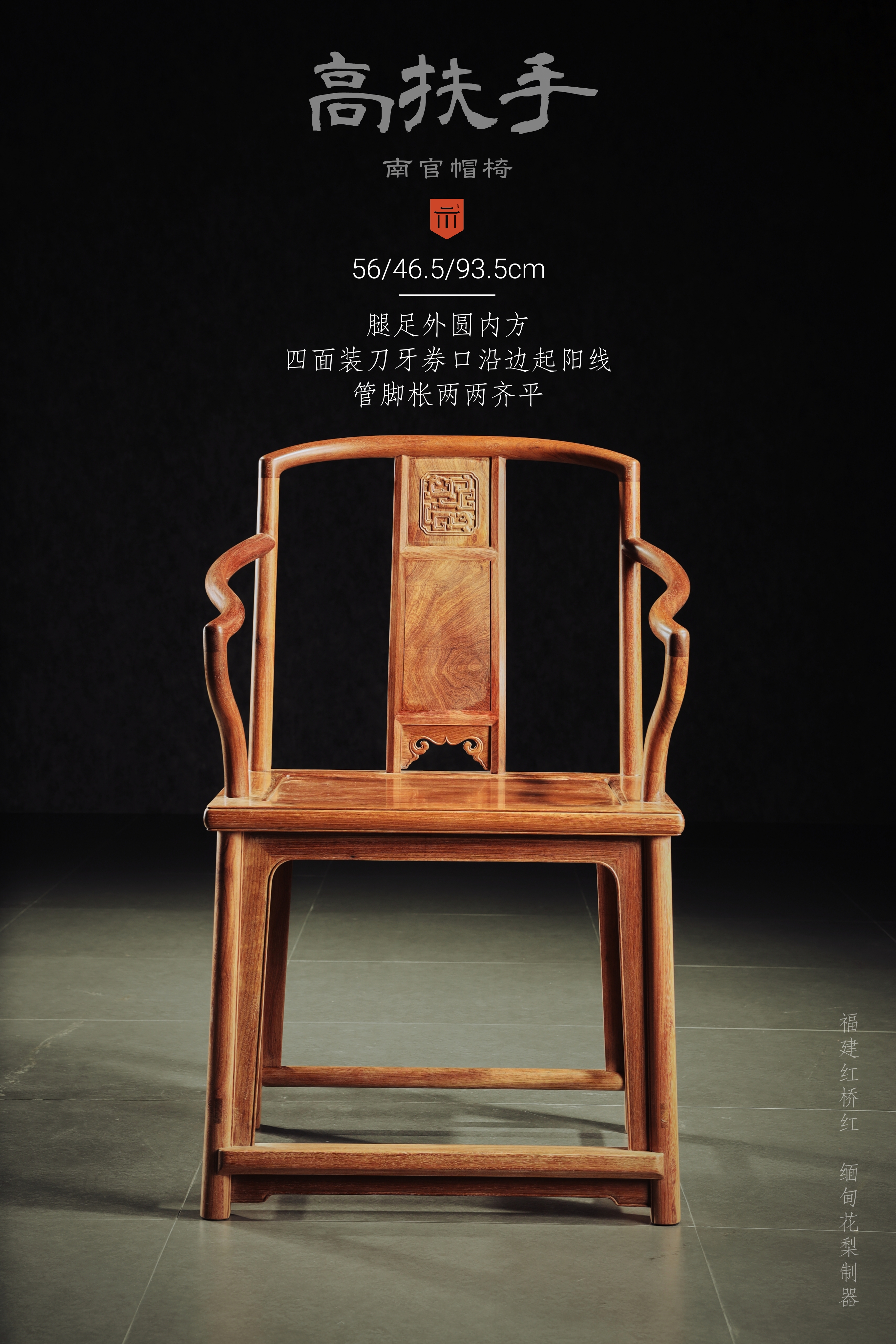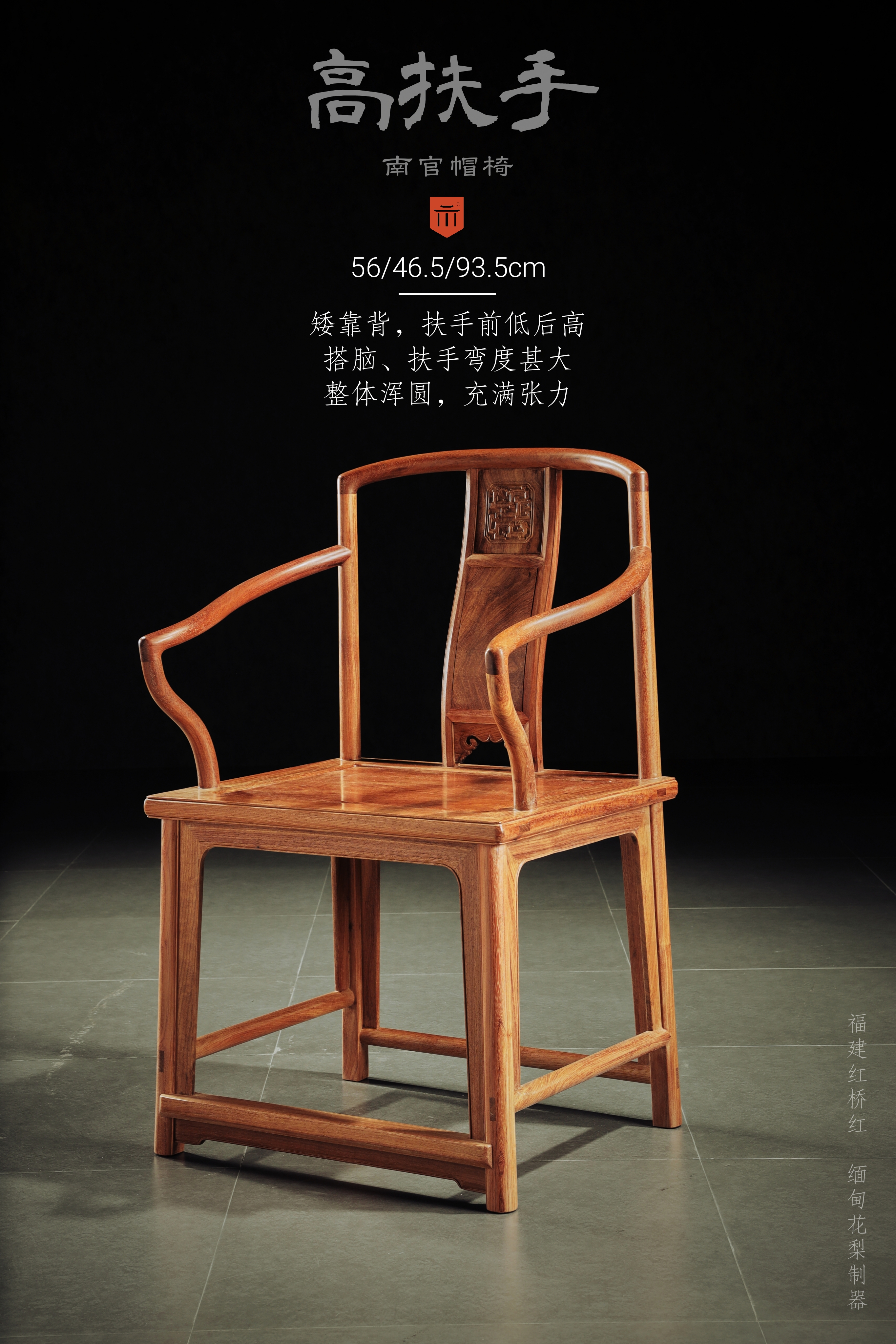 原型出自美国前加州中国古典家具博物馆,椅子搭脑与扶手以“挖烟袋锅榫”和后腿上截与前腿上截鹅脖连接,三弯靠背板浮雕花纹一朵,椅盘下素牙子,采用微微下垂“洼堂肚”式,椅子除去扶手后部较高,可视为矮型南官帽椅基本式,扶手后部较高,能达到与圈椅异曲同工的效果,令坐者不仅肘部有所倚托,腋下一段膀臂也得到支承。