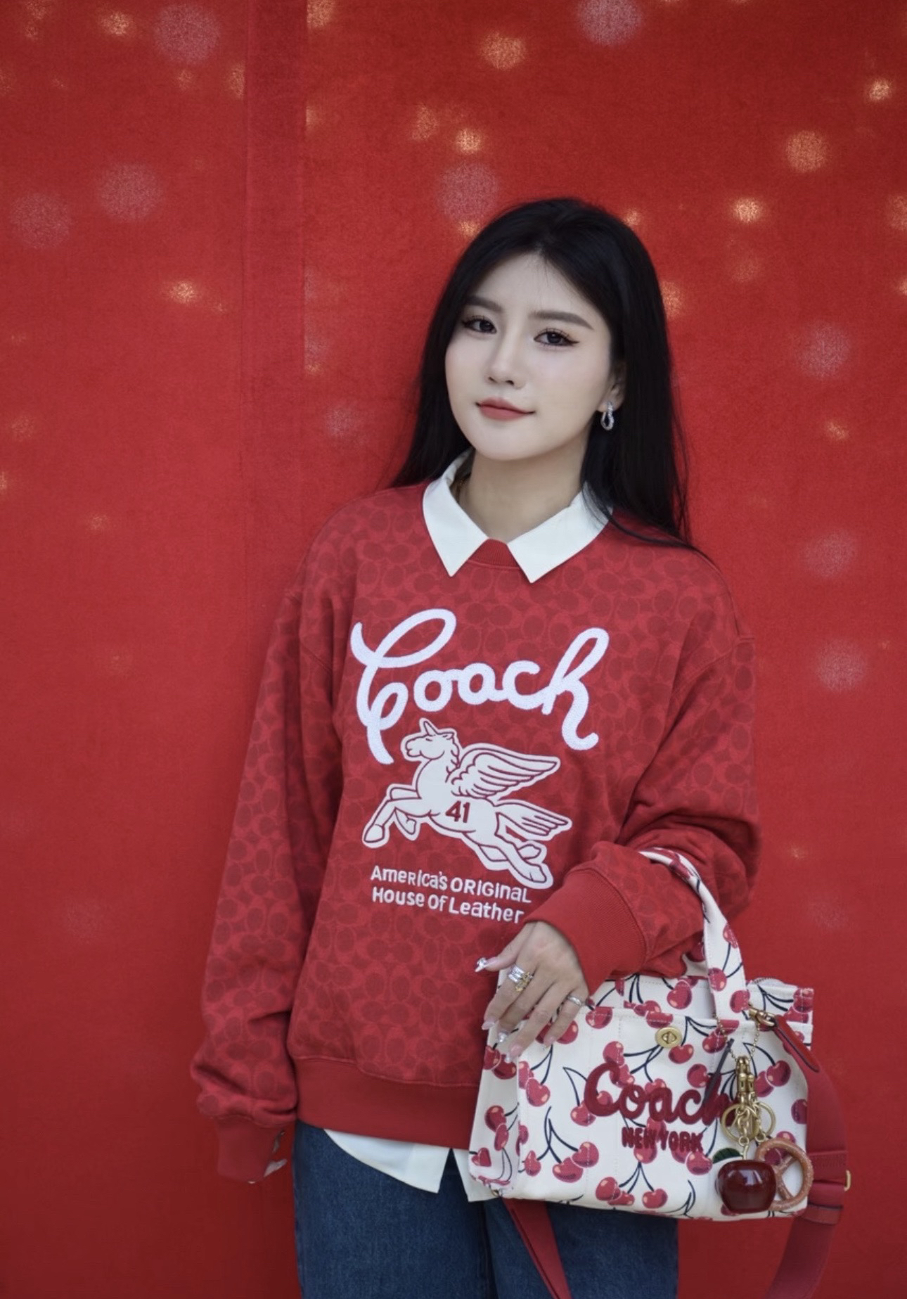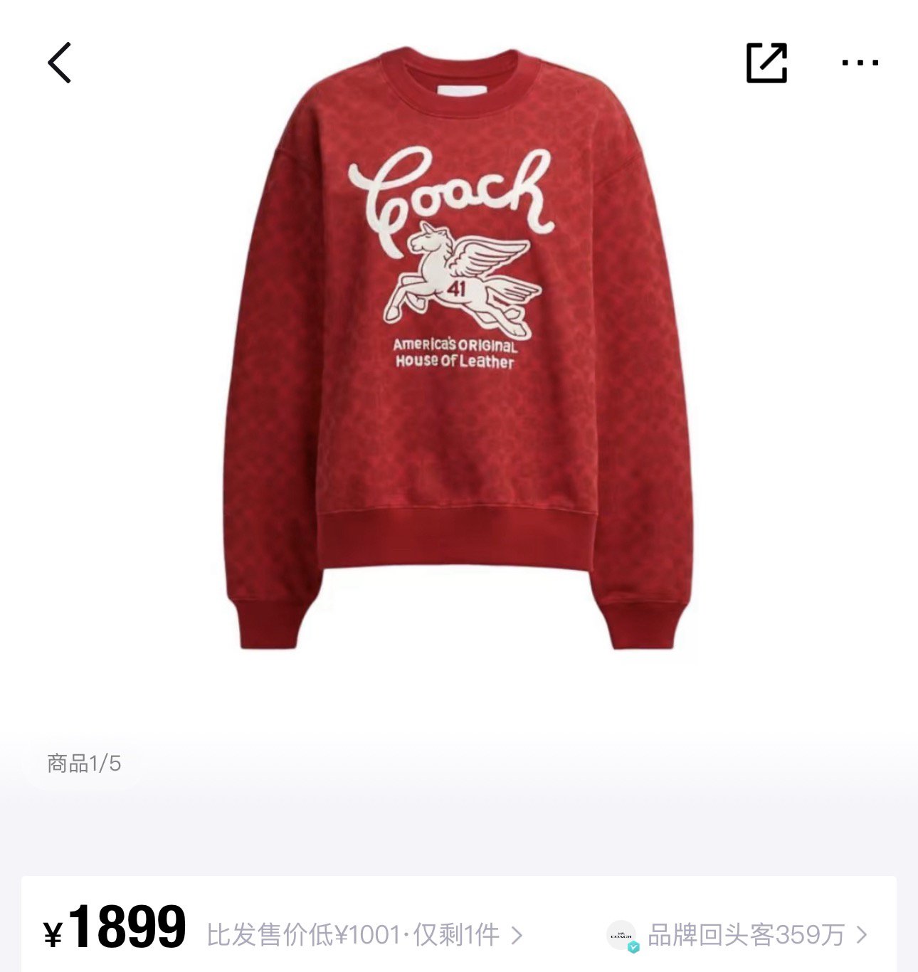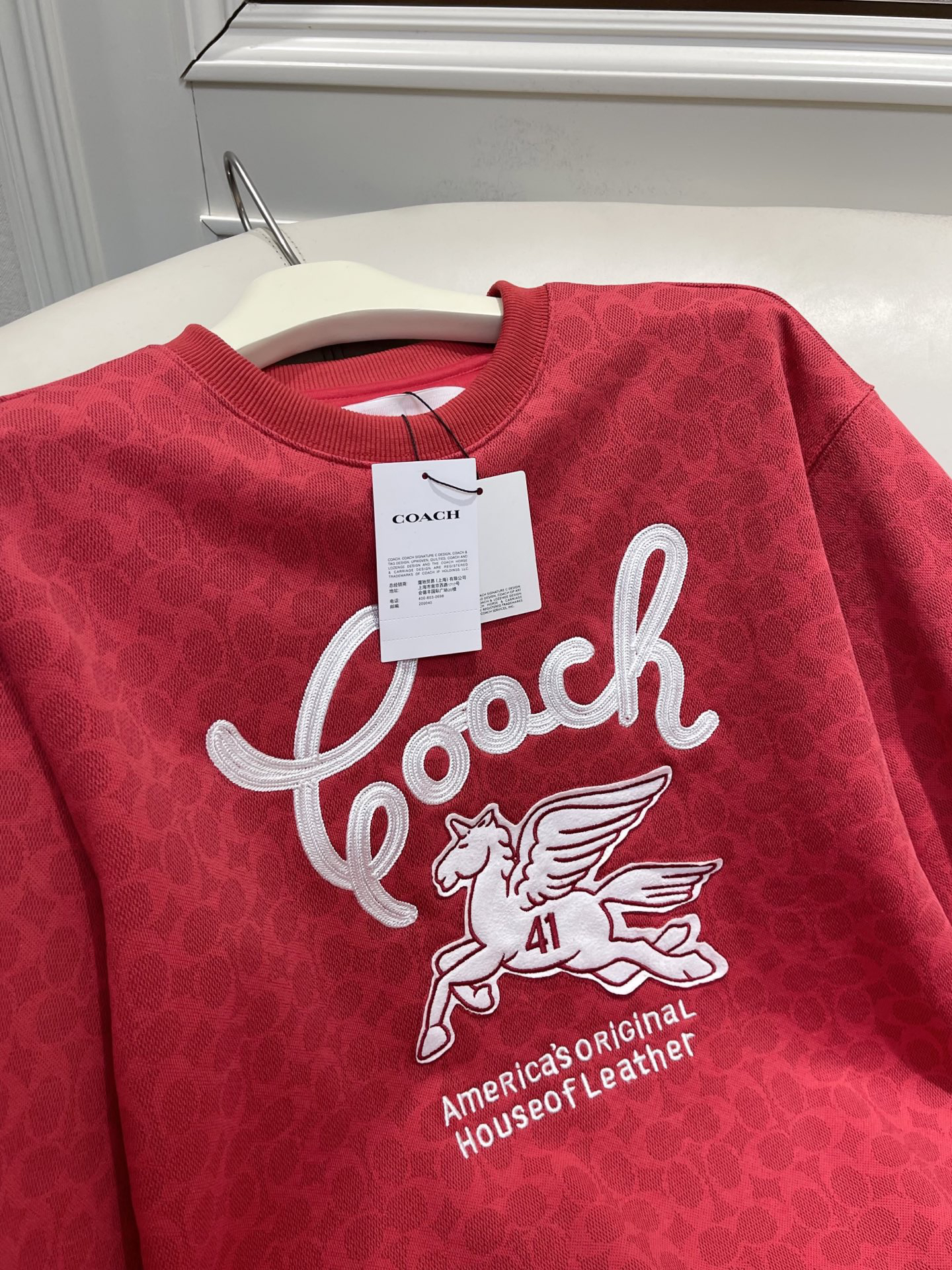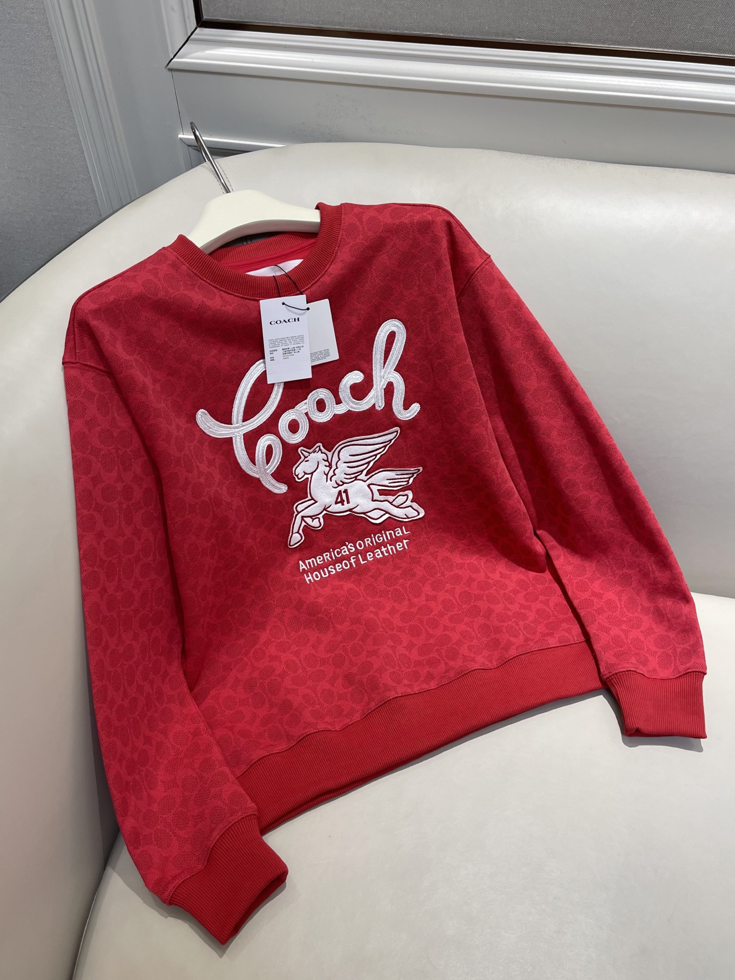 Coach家的经典满印老花logo非常有辨识度 高级感十足,胸前的飞马刺绣标识做装饰 精致贵气而不失优雅,搭裤装或裙装都毫不违和,喜庆吸睛的红色过年穿正合适!💰179顺丰包邮 国内代工厂订单余裁 纯原 最新款Coa*h蔻*女士飞马刺绣针织卫衣~某物在售1890 只有红色,标牌齐全 推荐自留,可作为新年礼物🎁直接送人!