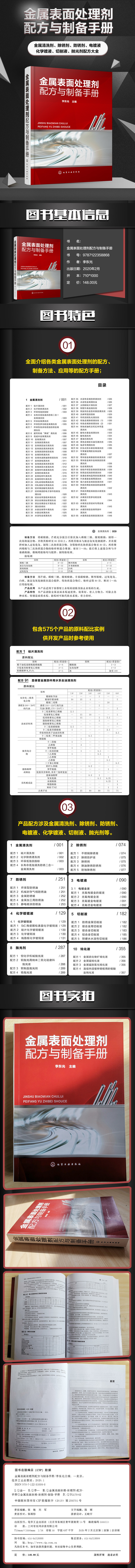 为了满足市场的需求,我们在化学工业出版社的组织下编写了这本《金属表面处理剂配方与制备手册》,书中收集了574种金属表面处理剂制备实例,详细介绍了产品特性、应用、配方、原料和制备方法,旨在为金属表面处理工业的发展尽点微薄之力。