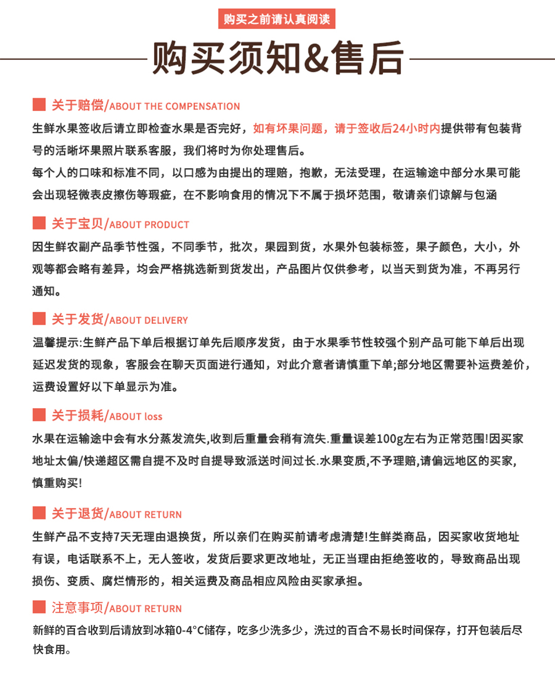 品名:兰州鲜百合规格1:1斤四头皇,4包共16颗 规格2:2斤四头皇,8包共32颗 规格3:四头皇碗装,125g*2碗 规格4:四头皇碗装,125g*4碗 规格5:四头皇碗装,125g*8碗 包装方式:网套+纸箱 快递:顺丰 运费模板:新疆、西藏、港澳台不发货 发货时效:48小时 发货地/产地:甘肃兰州 保质期:常温5-7天,冷藏10-15天 销售售卖期:8月到次年6月 周六周天、节假日除外,早上十点之前的订单是48小时发货 ,到货时间约为2-5天,请您耐心等待 |