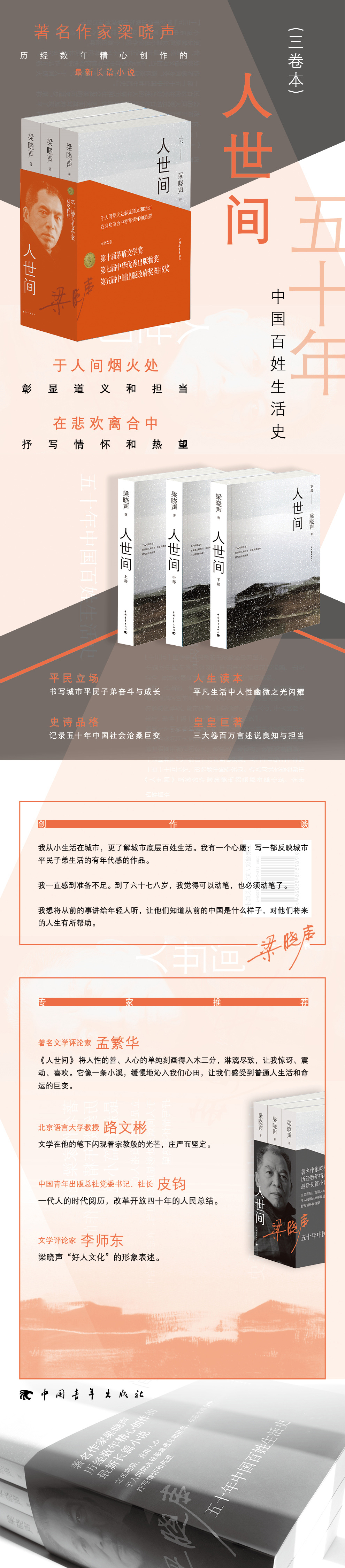 《人世间》(三卷本)是著名作家梁晓声的最新长篇小说。全书一百一十五万字,历经数年创作完成。作品以北方省会城市一位周姓平民子弟的生活轨迹为线索,从二十世纪七十年代写到改革开放后的今天,多角度、多方位、多层次地描写了中国社会的巨大变迁和百姓生活的跌宕起伏,艺术而雄辩地展现了平民百姓向往美好生活的人生努力和社会发展的历史进步,堪称一部“五十年中国百姓生活史”。