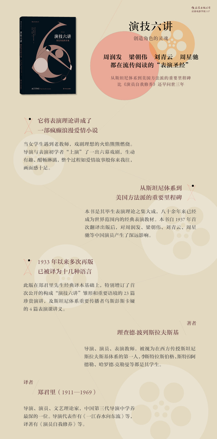 《演技六讲》一书诞生于1933年,被认为是举世第一本关于斯坦尼体系的著作,比斯坦尼斯拉夫斯基的《演员自我修养》还早问世三年。波列斯拉夫斯基在美国的导演和教学活动直接影响了数百名演员,培养出一批戏剧和电影界的领军人物。本书是其毕生表演理论之集大成,被视为从斯坦尼体系到美国方法派的重要里程碑,八十余年来已经成为世界范围内的经典表演教材。在中国,本书自1937年首次翻译出版后,对中国几代演员产生了深远影响。