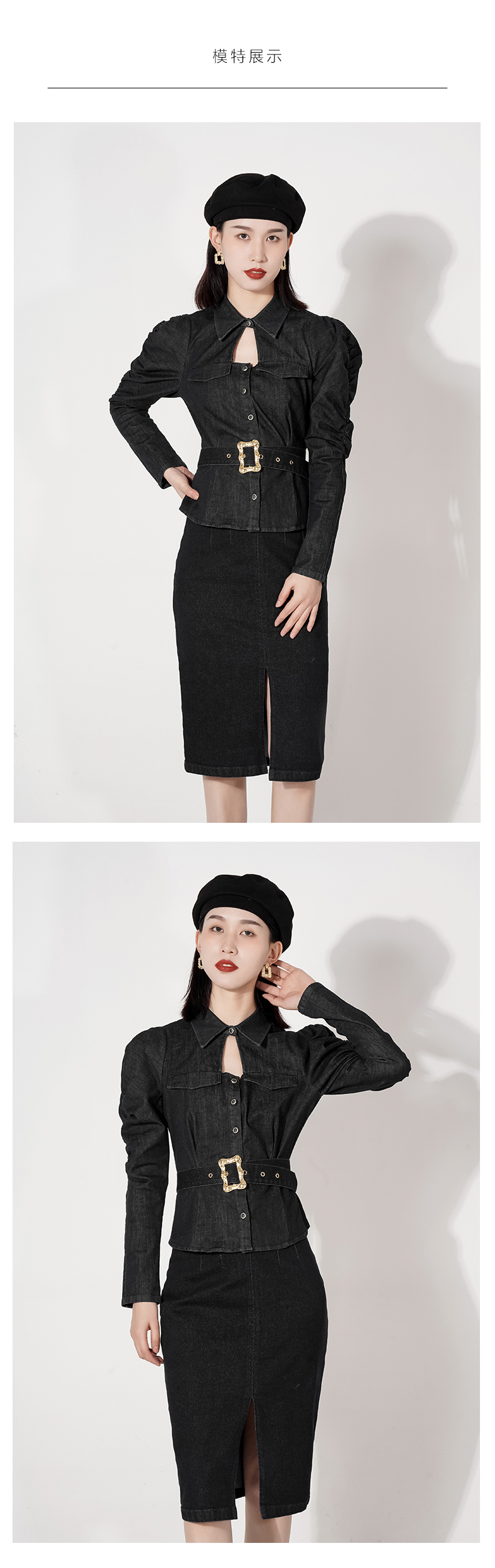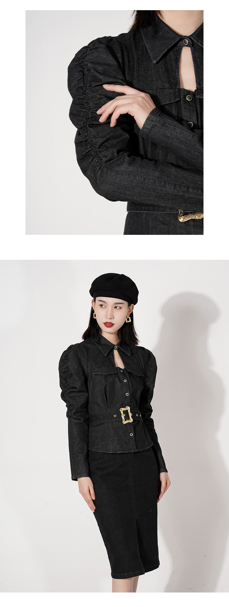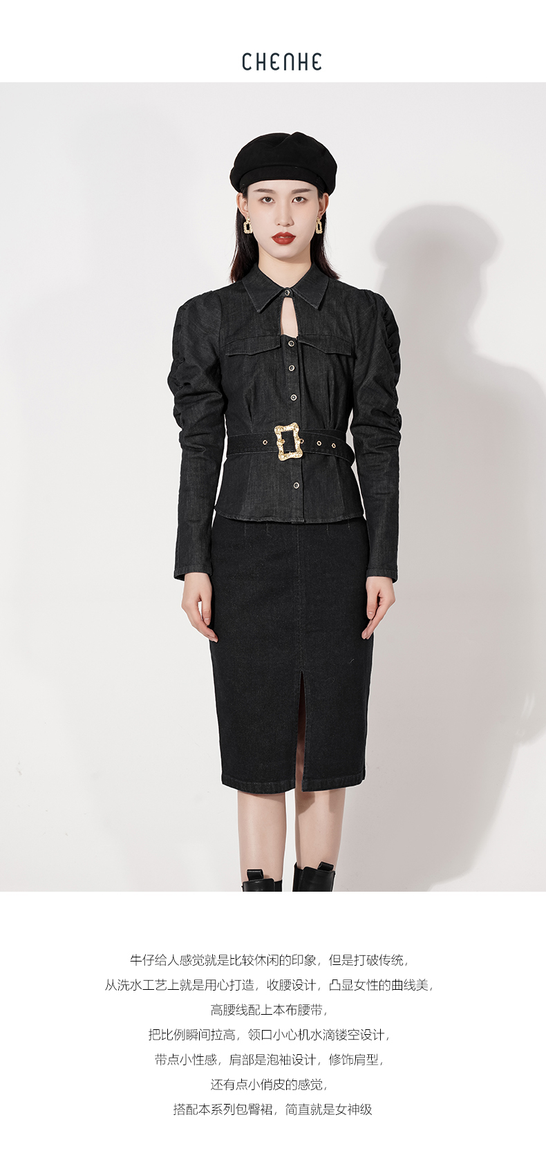 给人感觉就是比较休闲的印象,但是打破传统,从洗水工艺上就是用心打造,收腰设计,凸显女性的曲线美,高腰线配上本布腰带,把比例瞬间拉高,领口小心机水滴镂空设计,带点小性感,肩部是泡袖设计,修饰肩型,还有点小俏皮的感觉,搭配本系列包臀裙,简直就是女神级