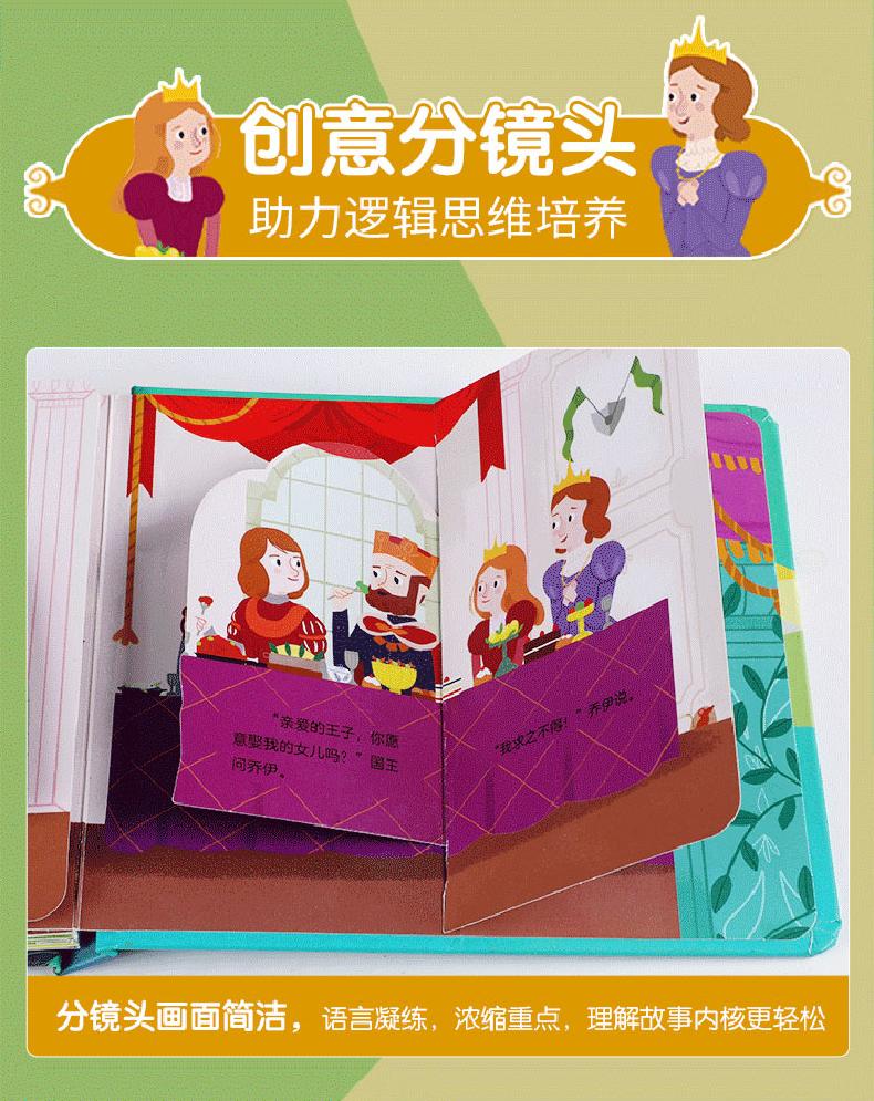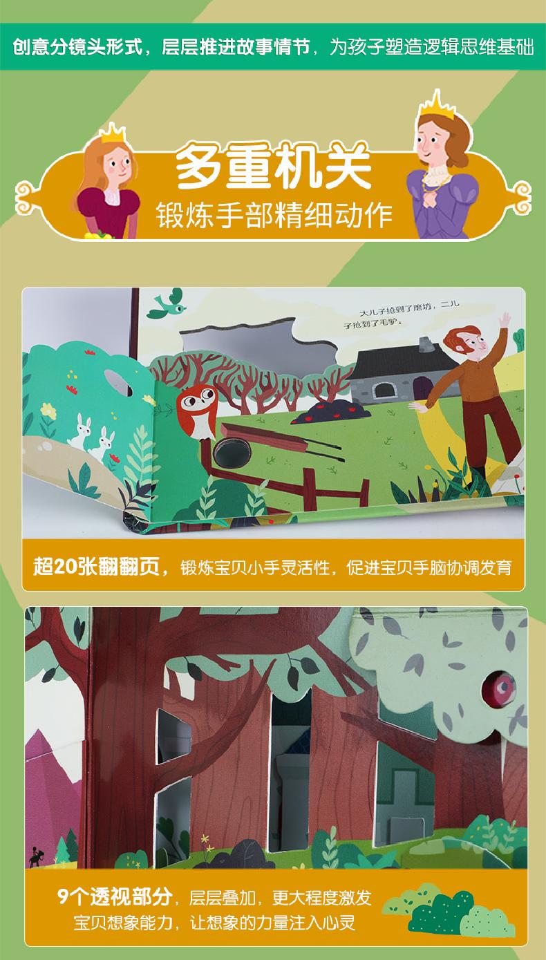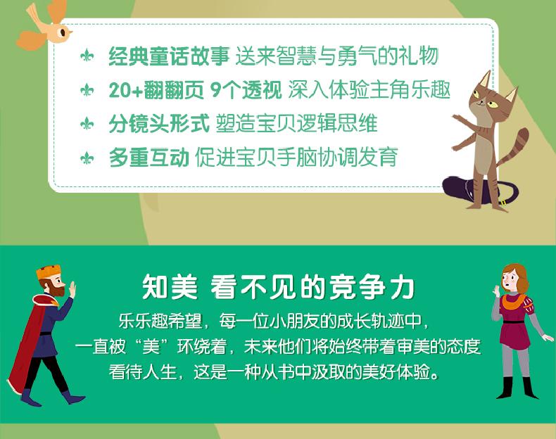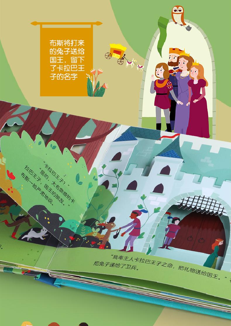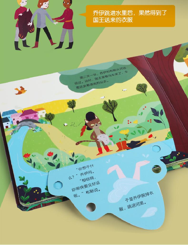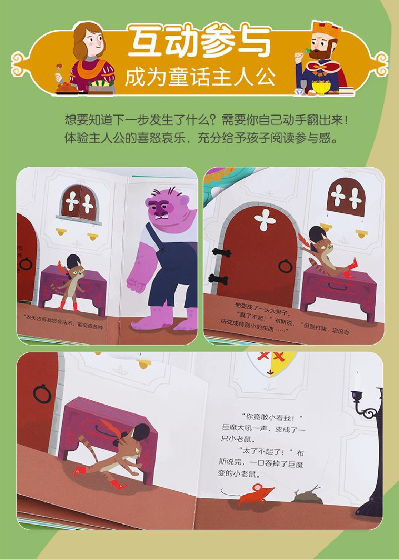 《穿靴子的猫》:磨坊主给三个孩子留了不同的东西,小儿子乔伊得到了一只会说话的猫。这只猫凭借自己的机智和勇敢帮助它穷困潦倒的主人翻身,不仅打败了富有的食人妖魔,还帮助主人得到了国王的青睐和公主的爱慕。本书运用精巧的翻翻、洞洞设计,将童话故事演绎成一幕幕真实的舞台剧,让孩子直接走进童话,在互动阅读中亲近、了解童话,体验主人公的喜怒哀乐。