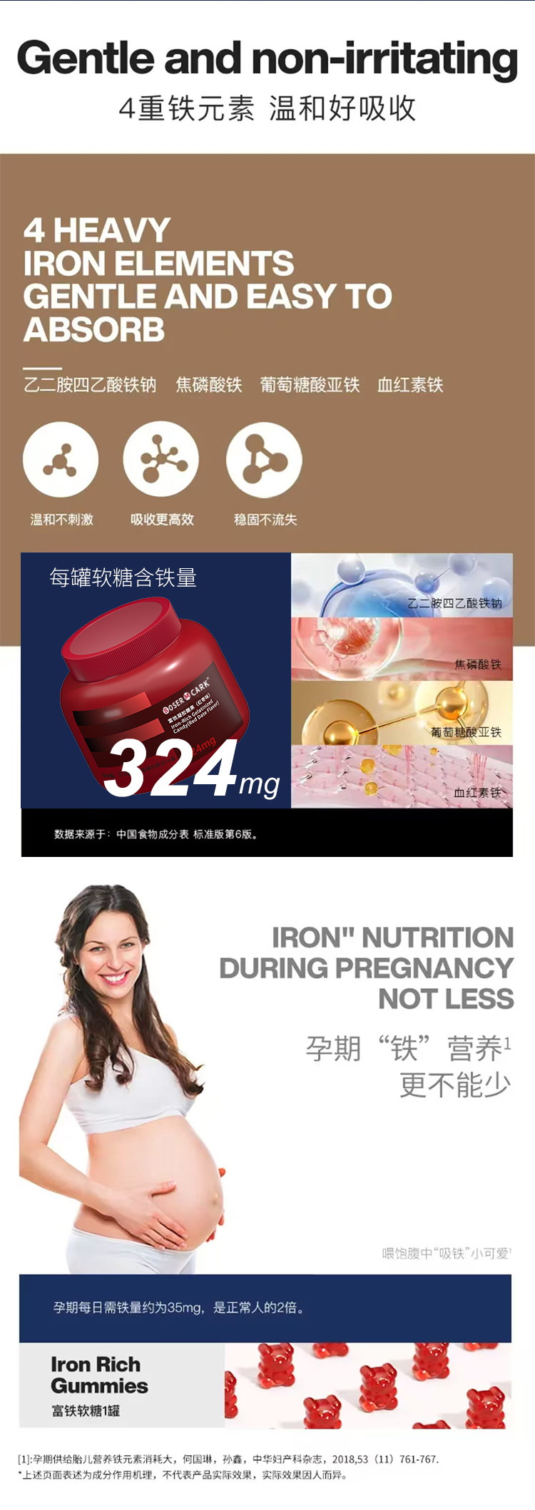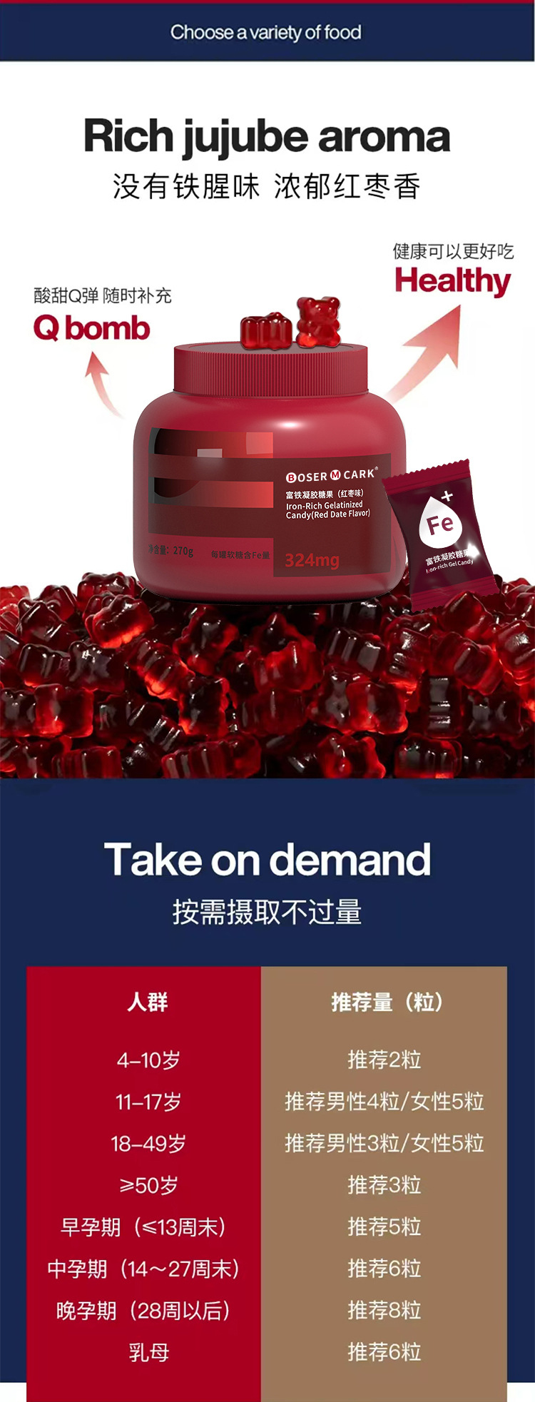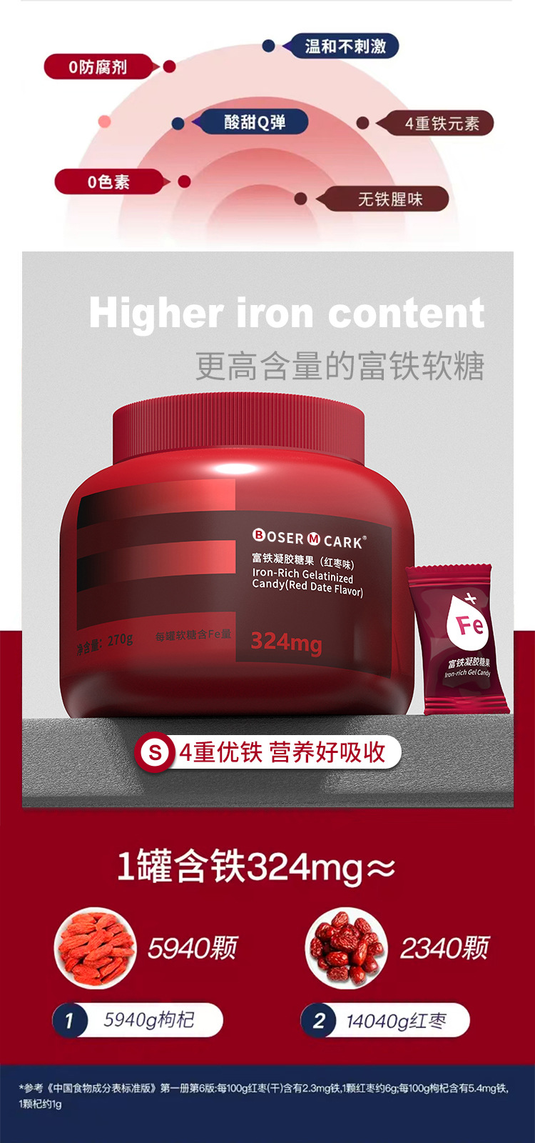 【酸甜适口!高含铁量】BoserMcark富铁凝胶软糖补充铁元素大罐装红枣味软糖含铁量324mg。xb