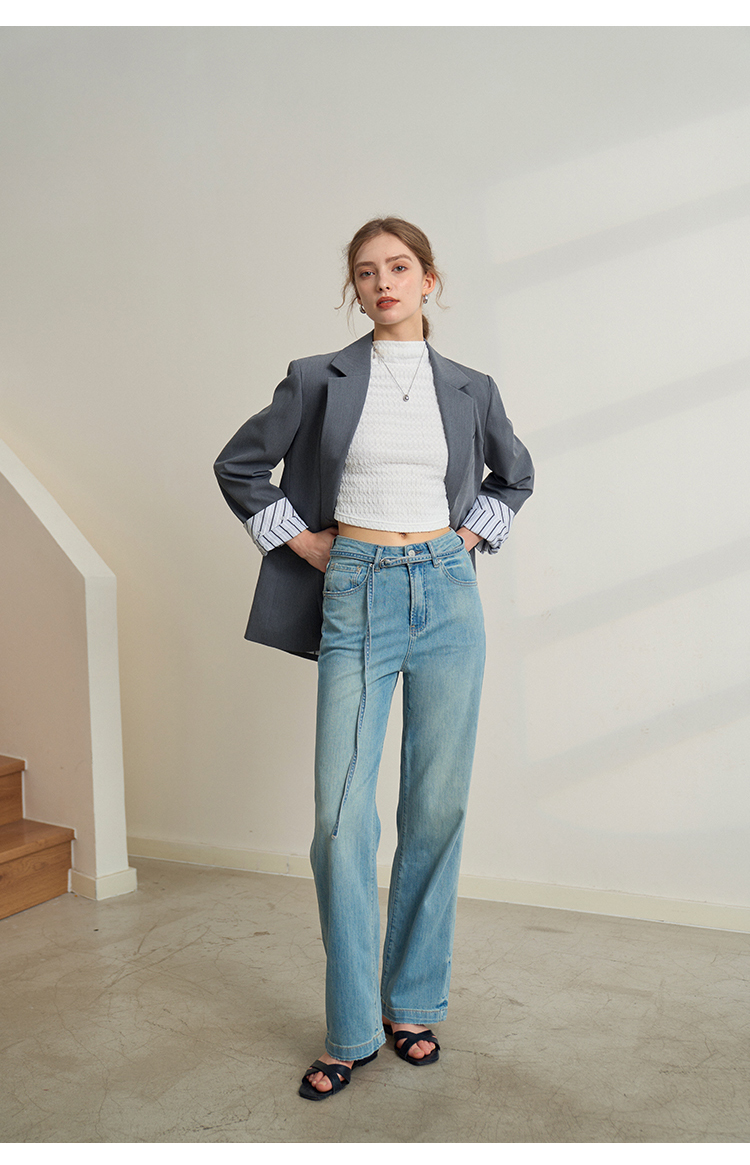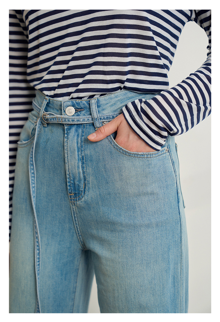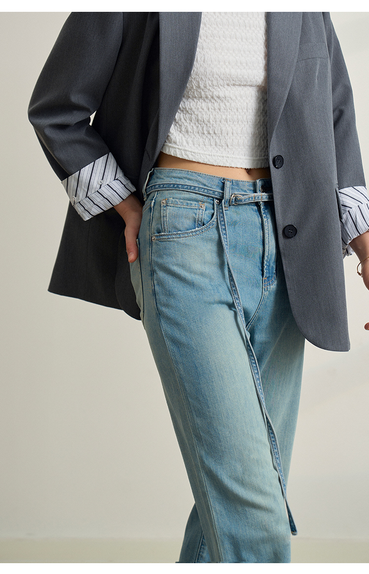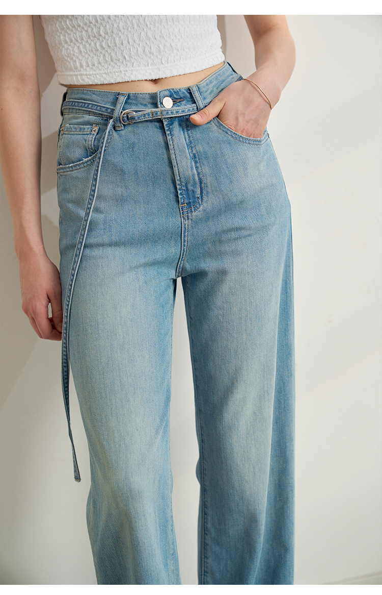 HeyDress复古牛仔裤女春夏高腰系带宽松显瘦阔腿裤百搭长款裤子