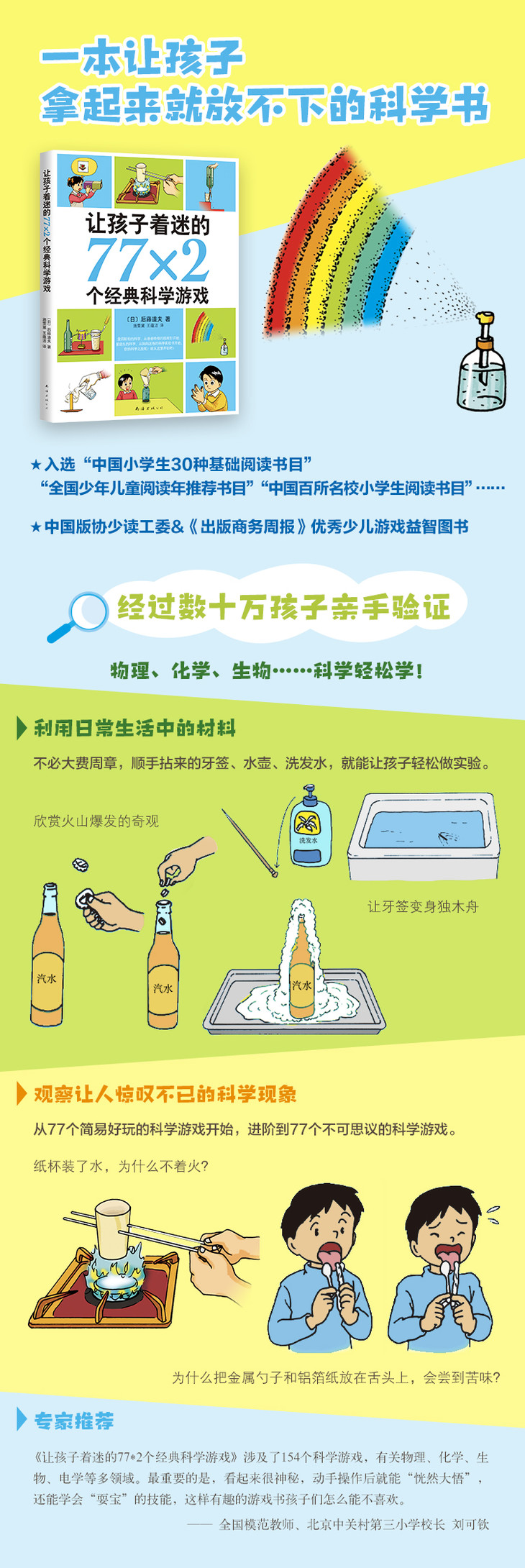 《让孩子着迷的77*2个经典科学游戏》涉及了154个科学游戏,有关物理、化学、生物、电学等多领域。zui重要的是,看起来很神秘,动手操作后就能“恍然大悟”,还能学会“耍宝”的技能,这样有趣的游戏书孩子们怎么能不喜欢。——全国模范教师、北京中关村第三小学校长 刘可钦