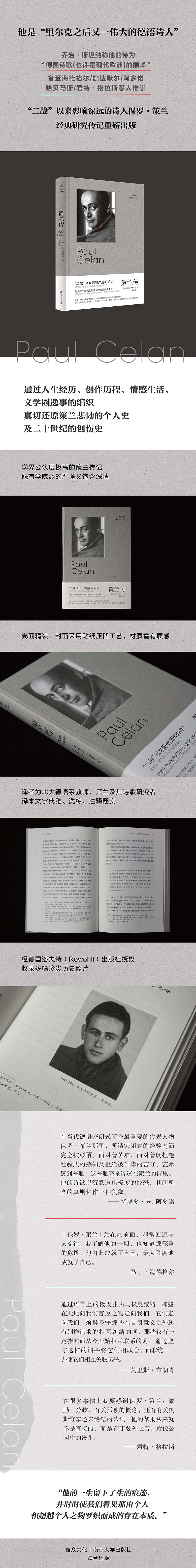 策兰的伤痛体验始终伴随着他,这些体验如何见诸他的诗作?我们又是否应该将策兰的诗歌与生平区别看待?策兰研究专家沃夫冈·埃梅里希教授,以其扎实的学术研究、准确的叙事、至诚的情感,讲述了策兰跌宕的一生,他通过对策兰人生经历、创作历程、情感生活、文学事件的巧妙编织,真切地展现了策兰悲恸的个人史,以及二十世纪的创伤历史。