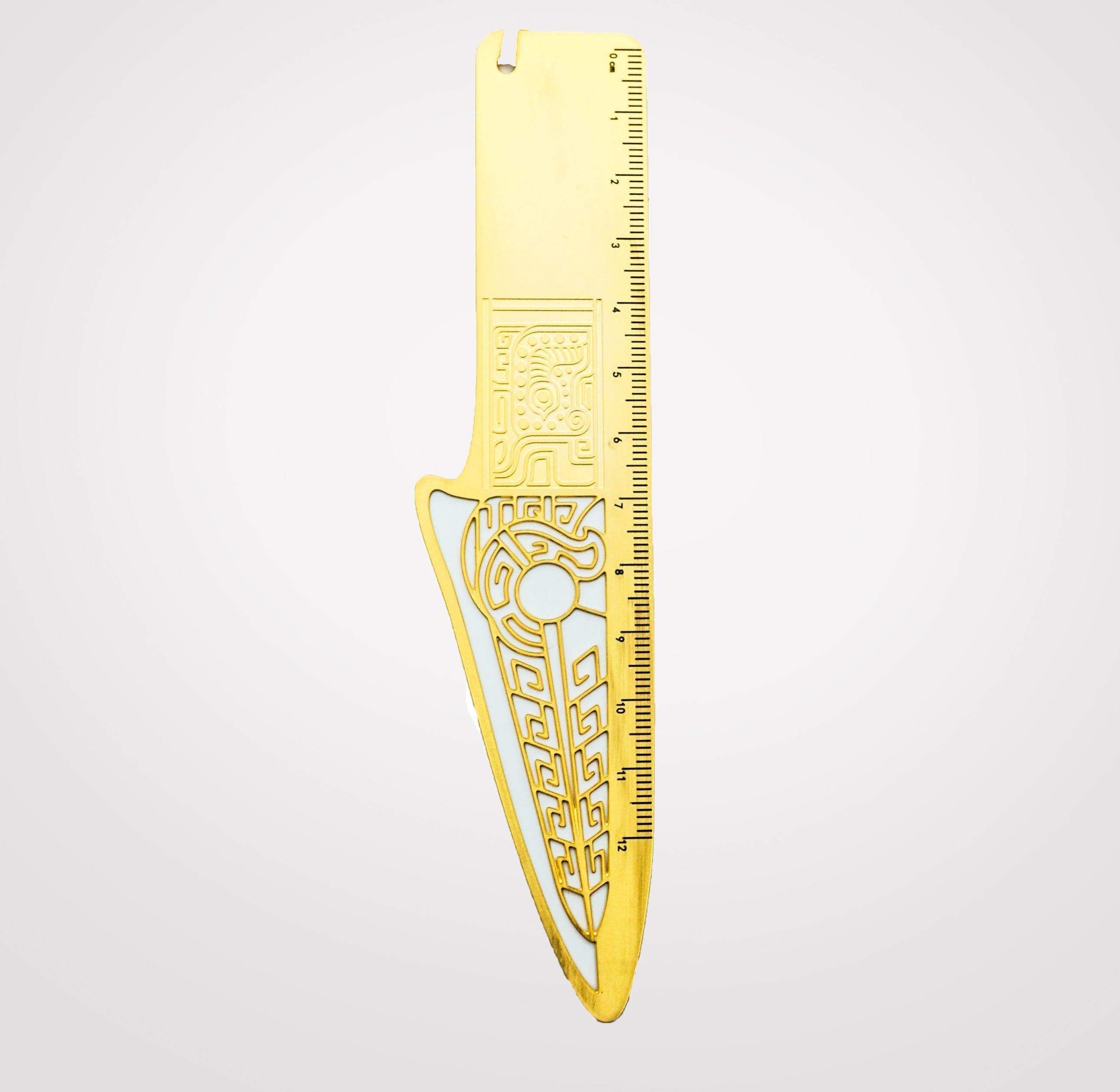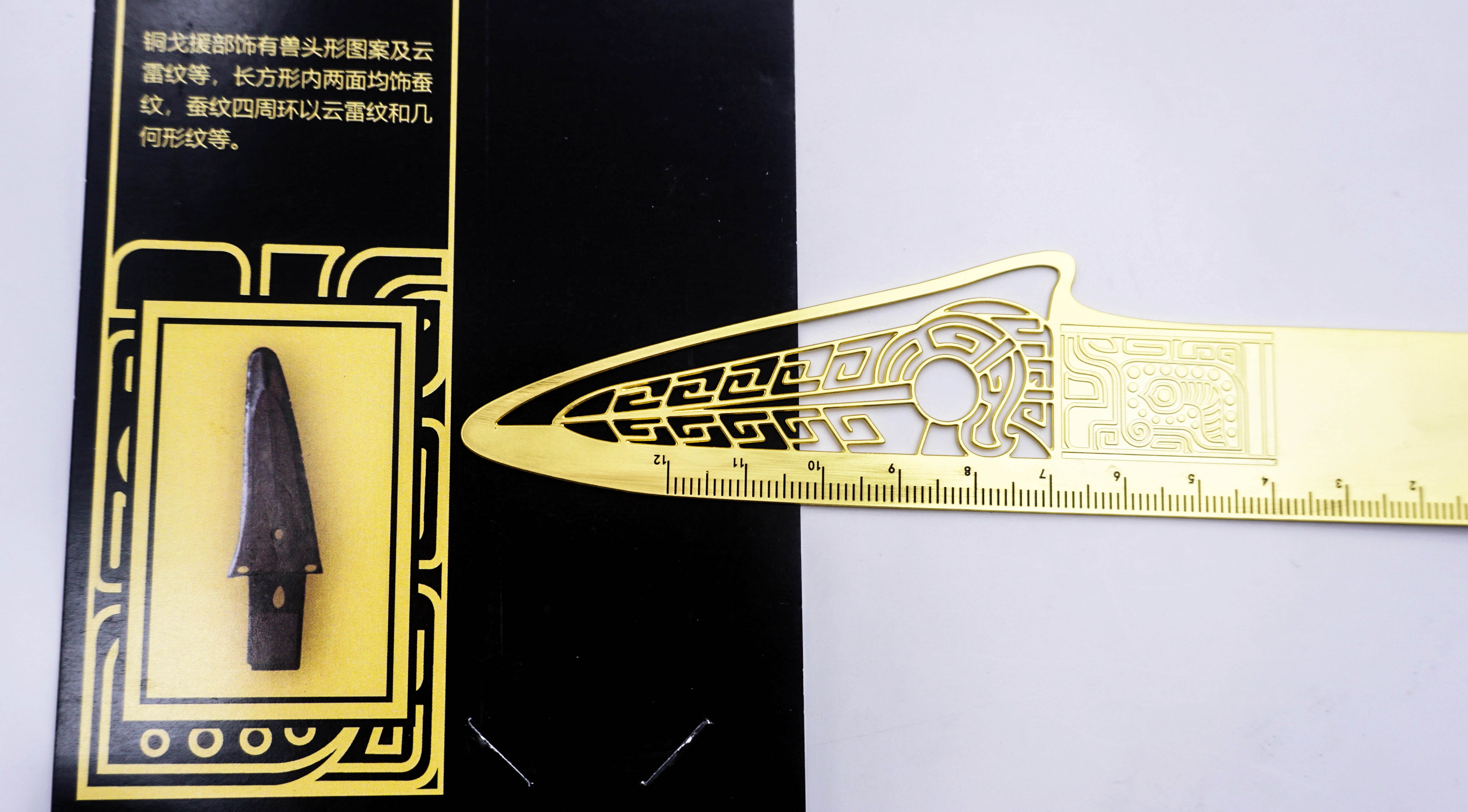 战国蚕纹铜戈铜尺 黄铜材质,采用激光雕刻工艺制作而成,能够精准展现战国铜戈的独特线条和别样的气质
