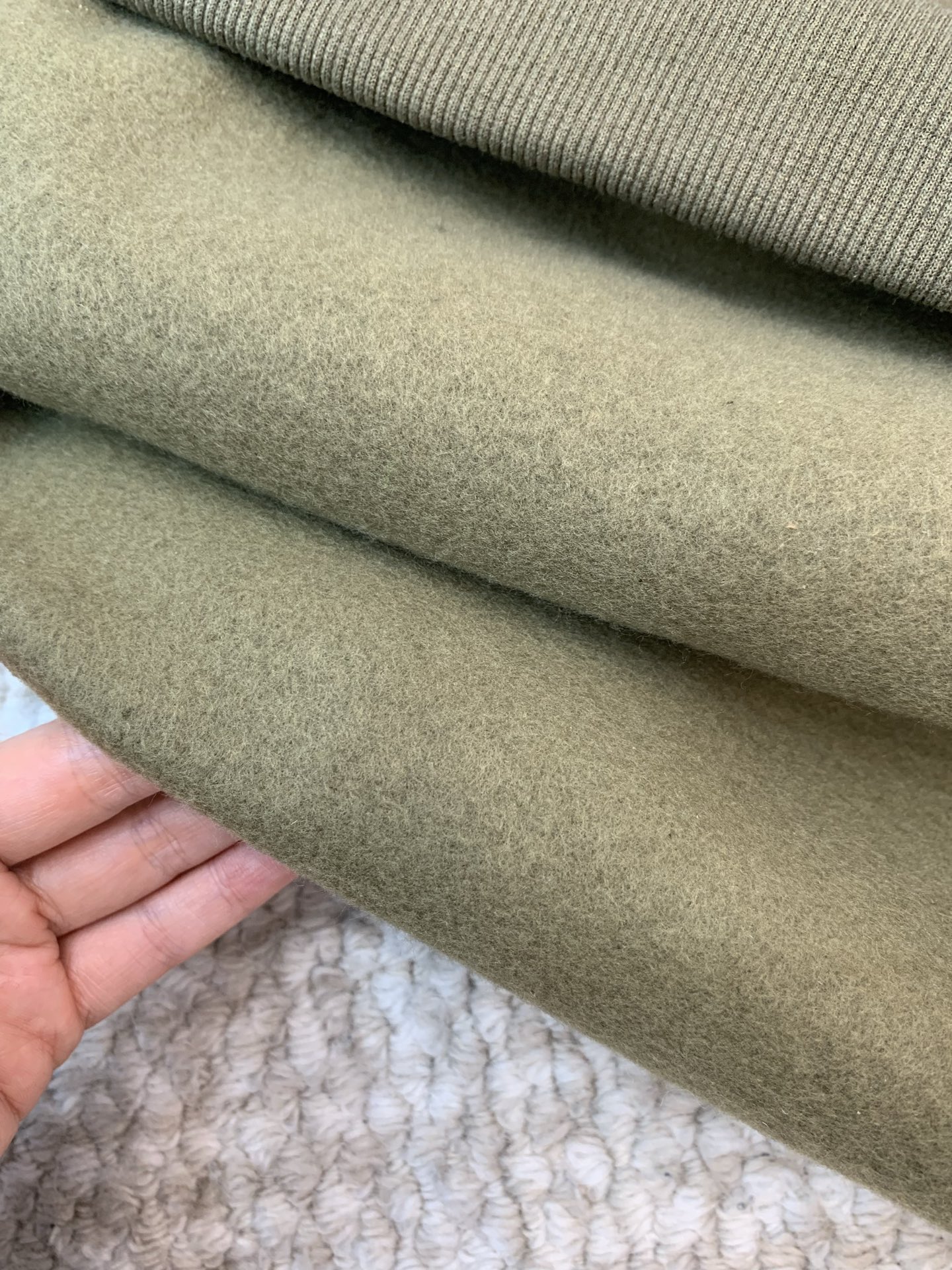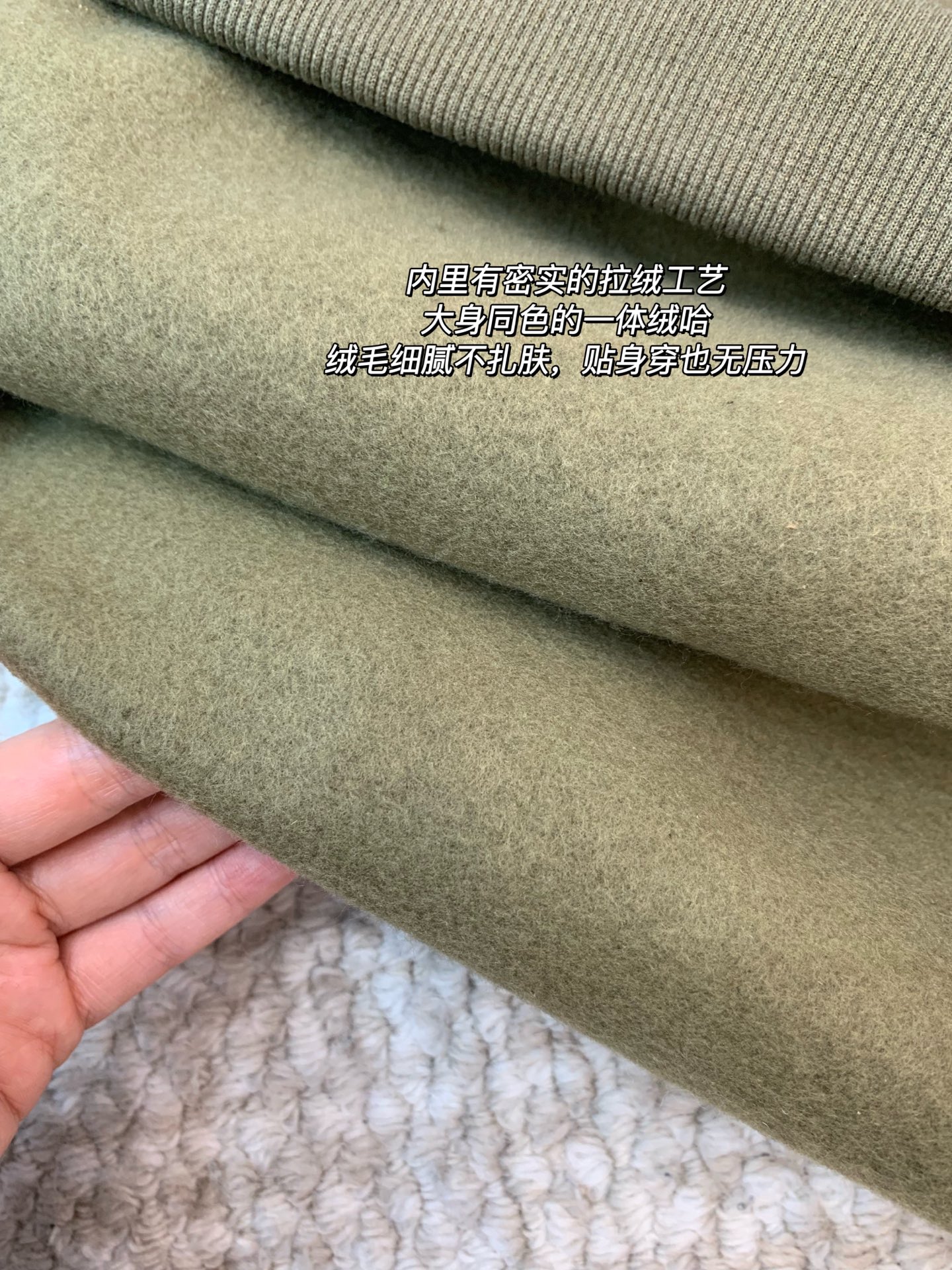 内里有密实的拉绒工艺,大身同色的一体绒哈,绒毛细腻不扎肤,贴身穿也无压力。