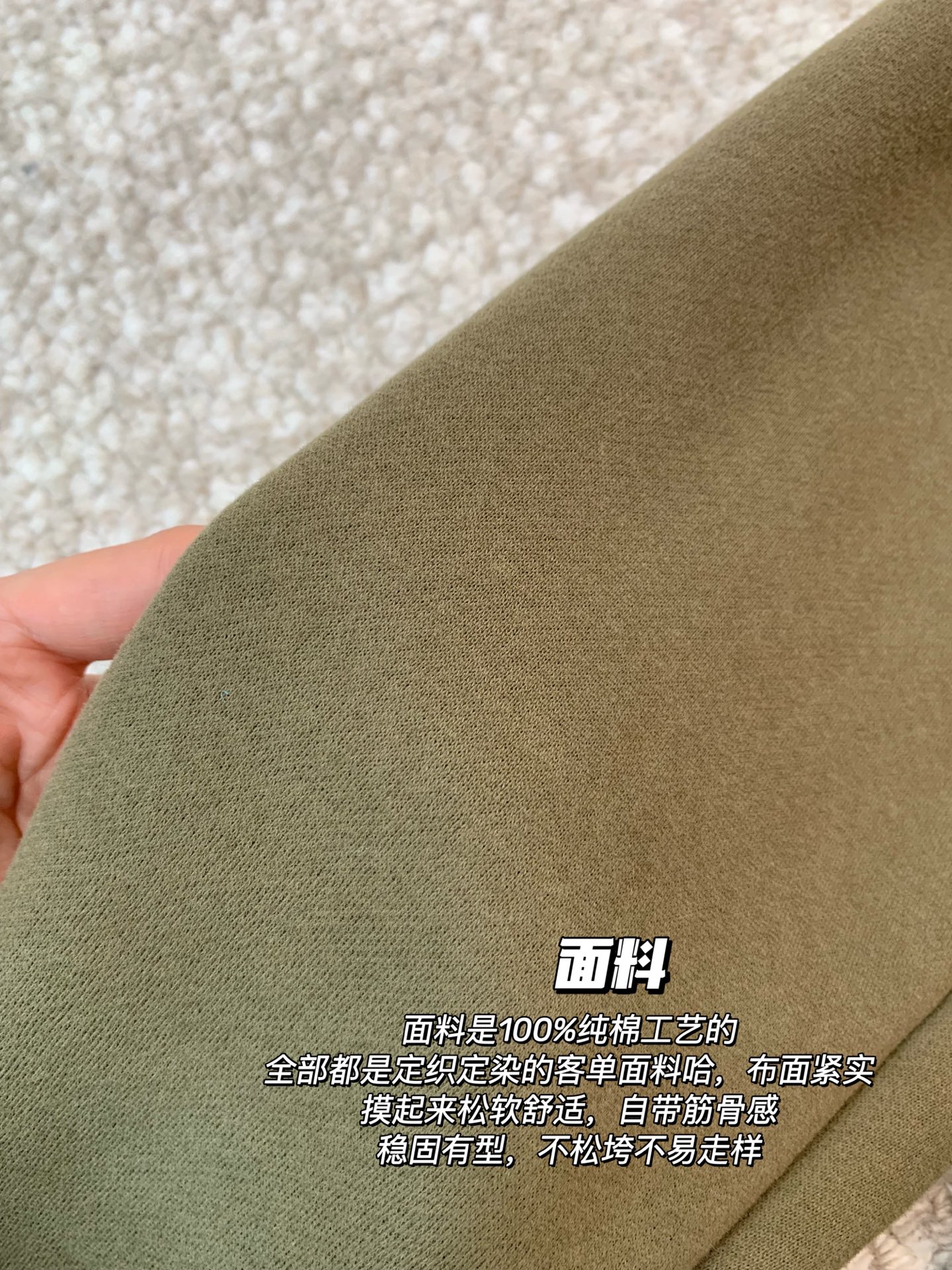 面料是100%纯棉工艺的,全部都是定织定染的客单面料哈,布面紧实,摸起来松软舒适,自带筋骨感,稳固有型,不松垮不易走样。