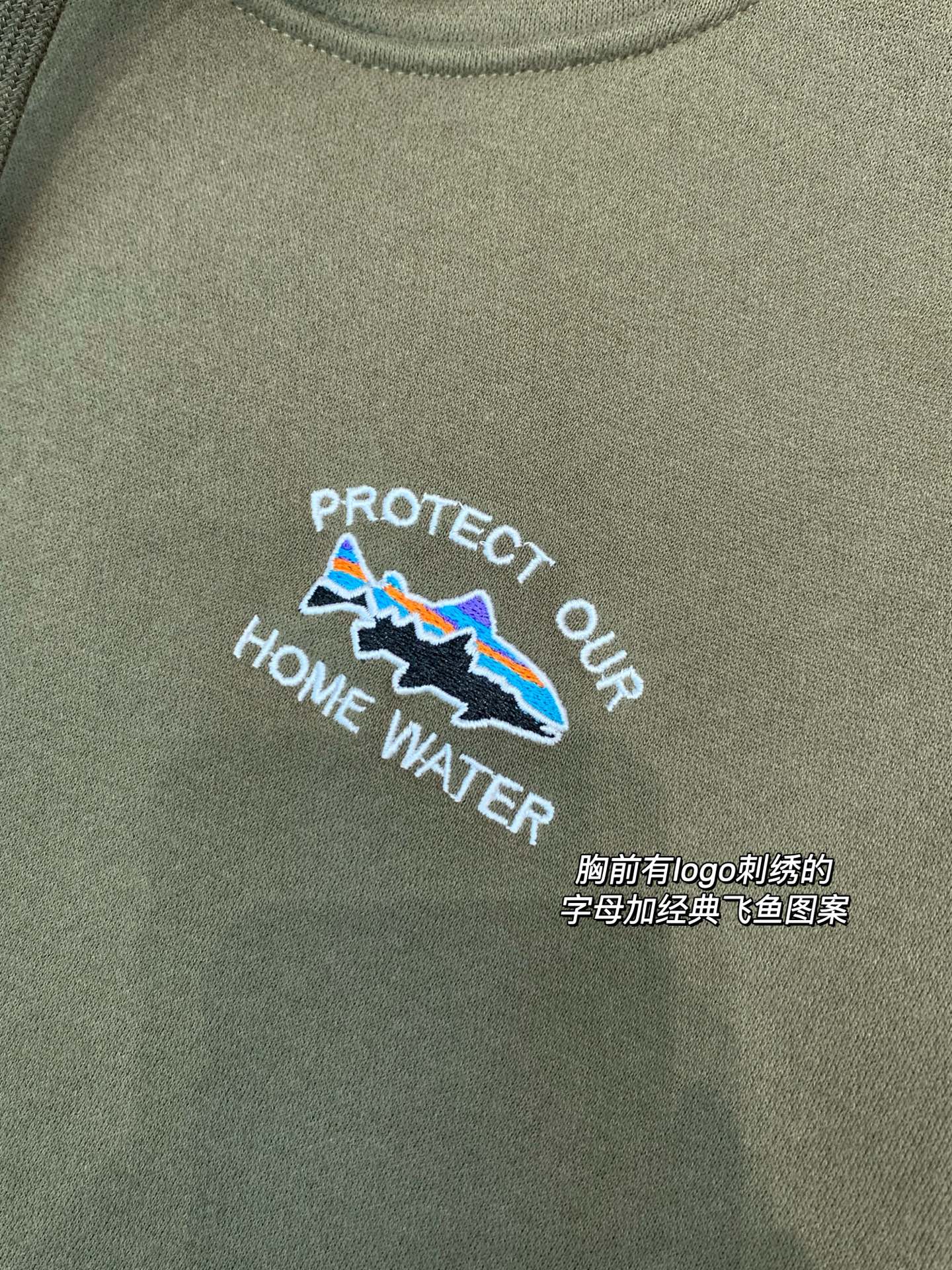 ➡️胸前胸前「PROTECT OUR HOME WATER」的标语+标志性飞鱼图案,配色低调又有辨识度,彰显环保态度。