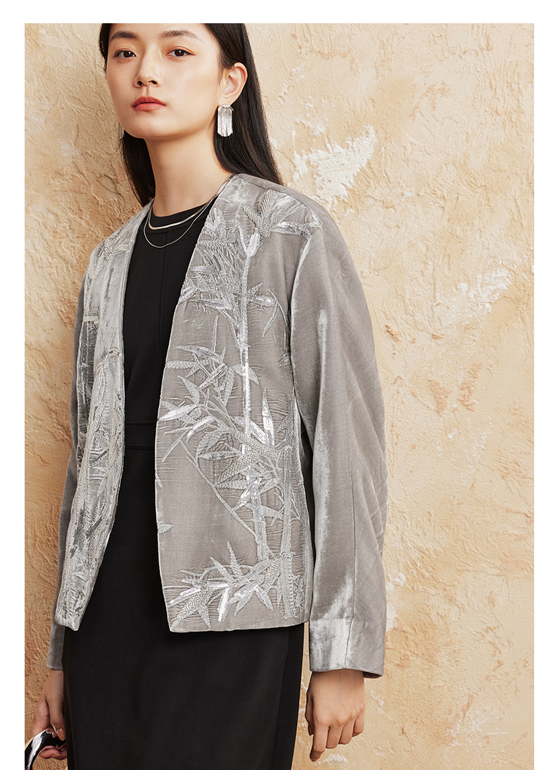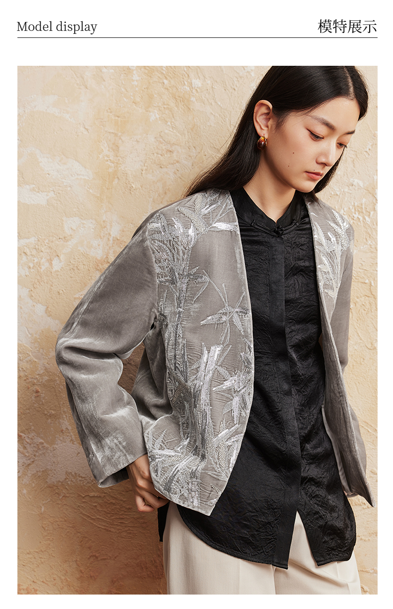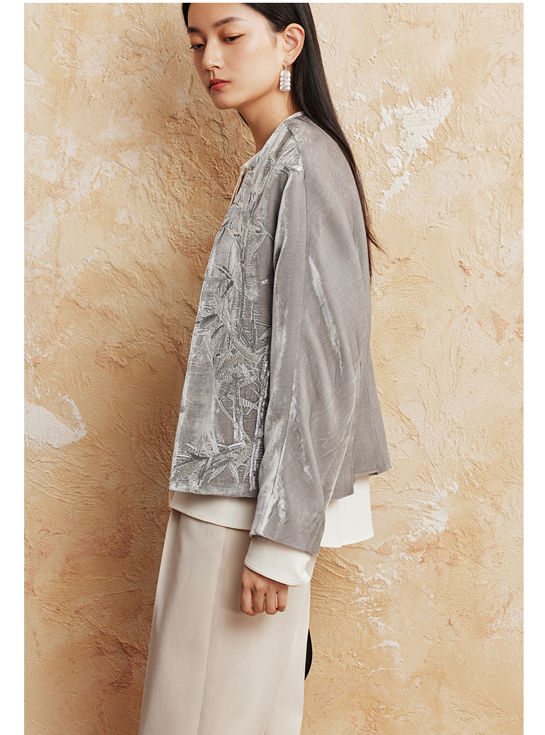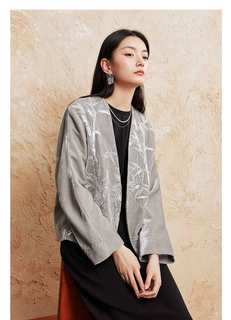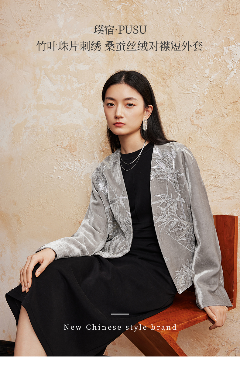 璞宿PUSU 青竹珠绣 桑蚕丝绒对襟短外套54111