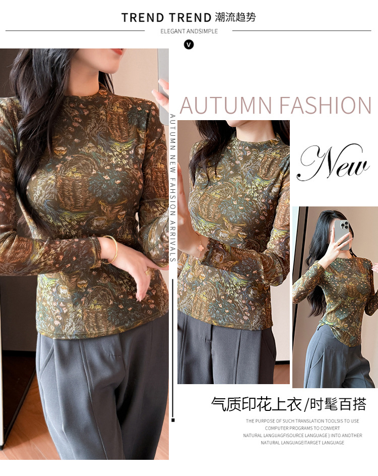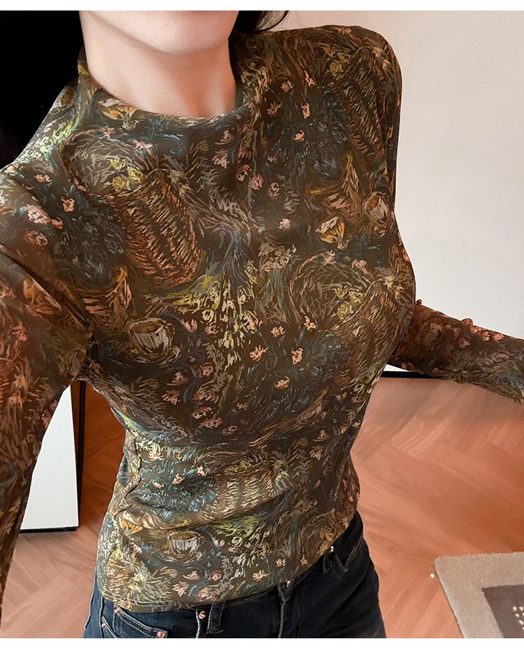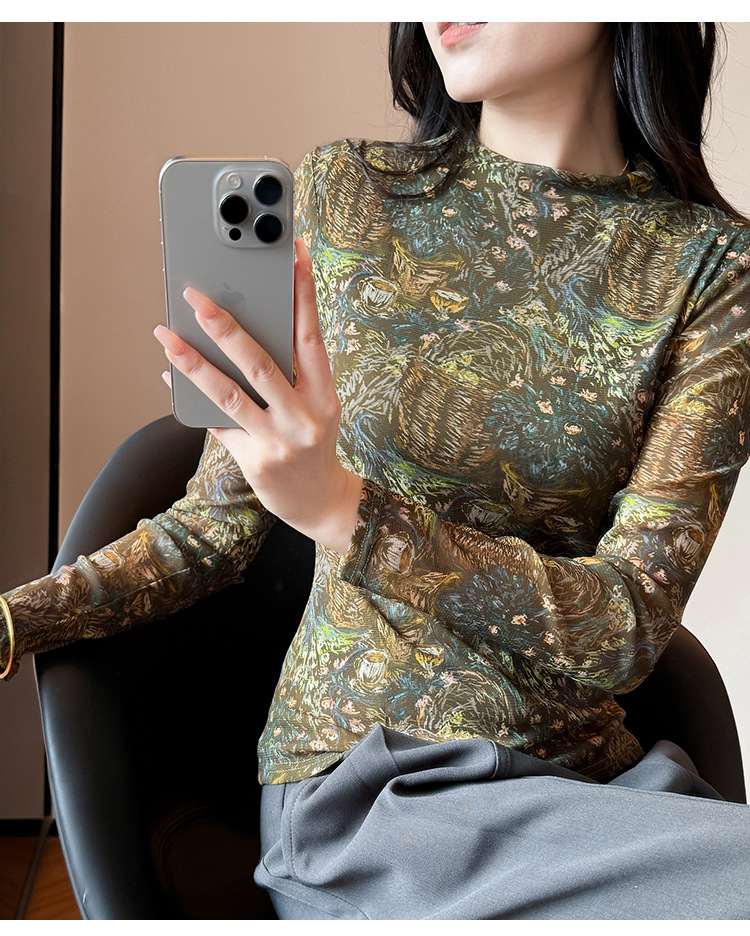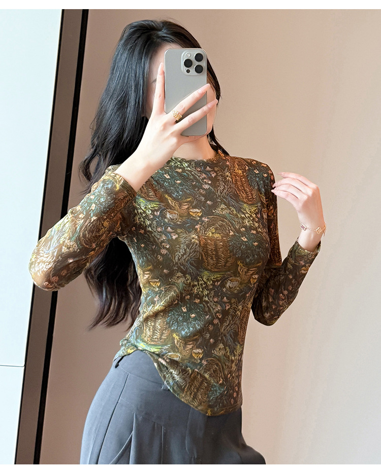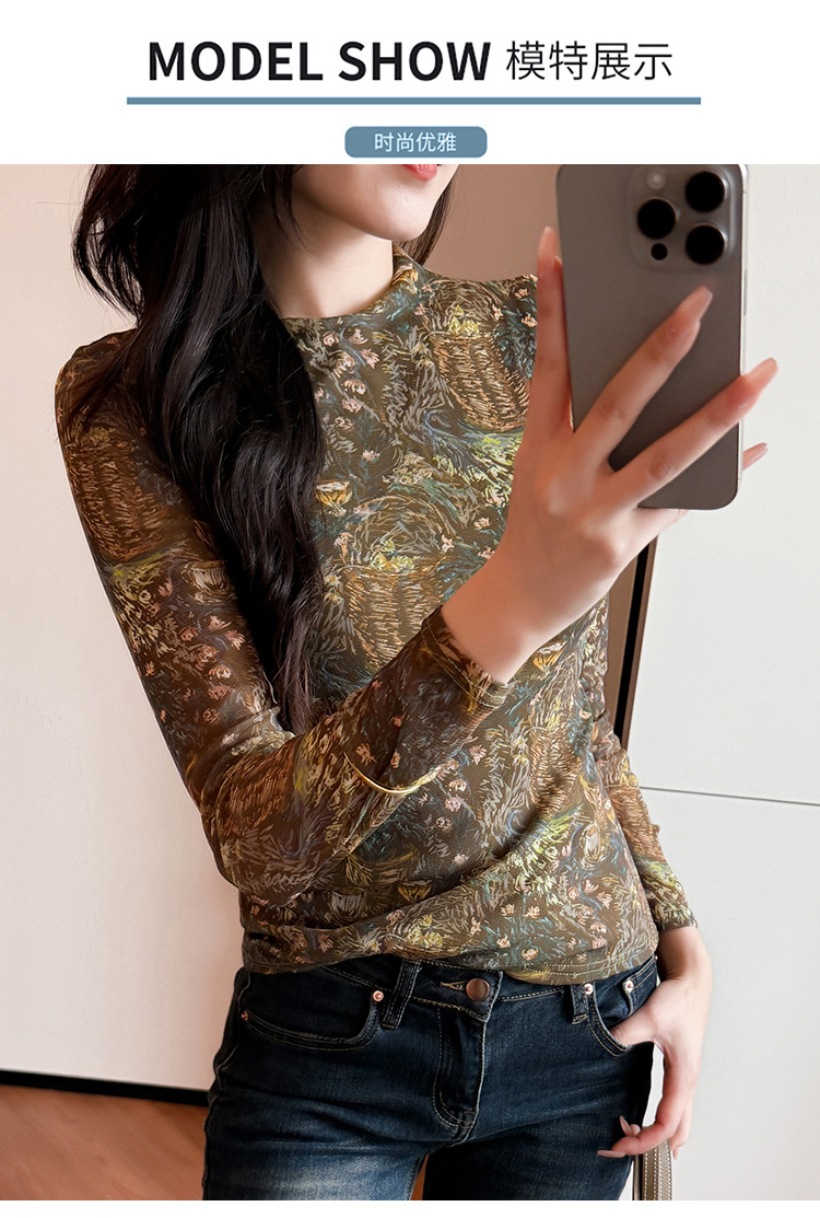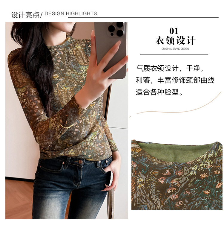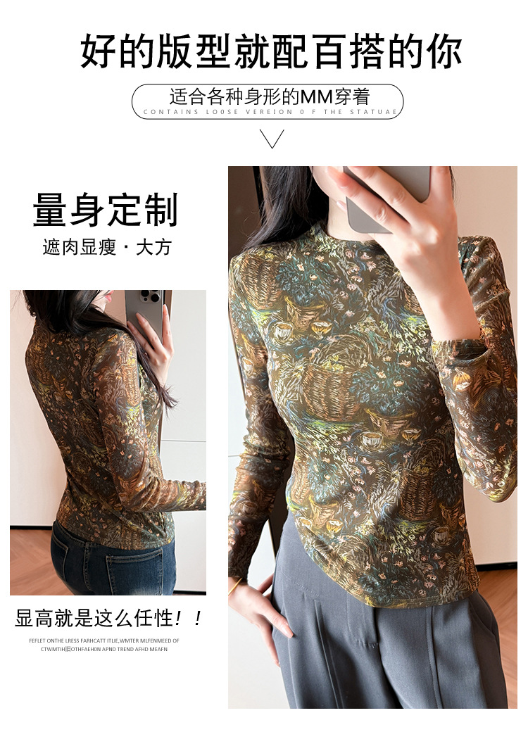 KQL A55F8717时尚洋气高弹网纱T恤长袖印花高领打底衫