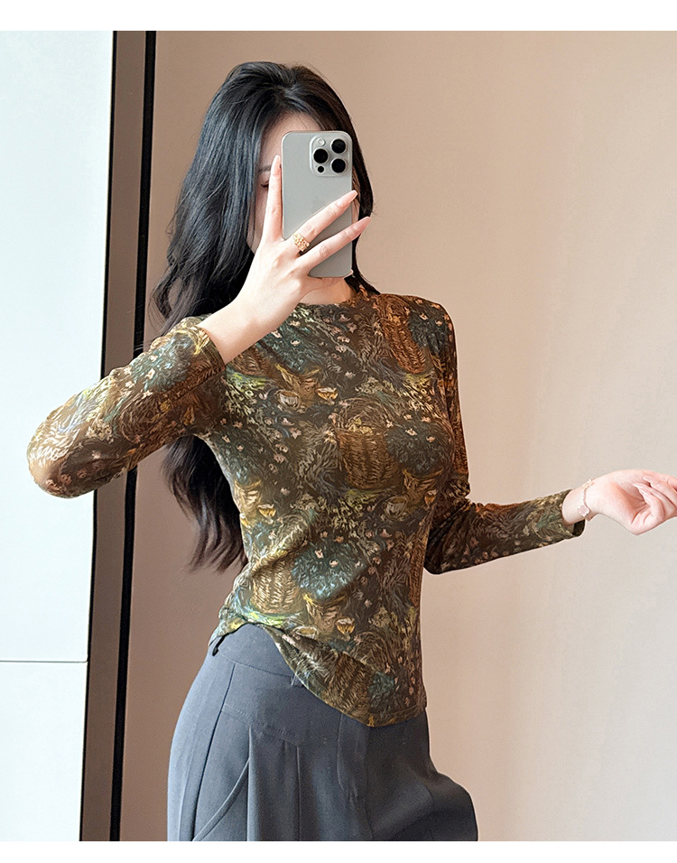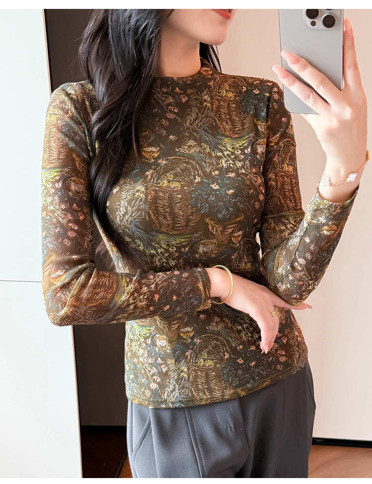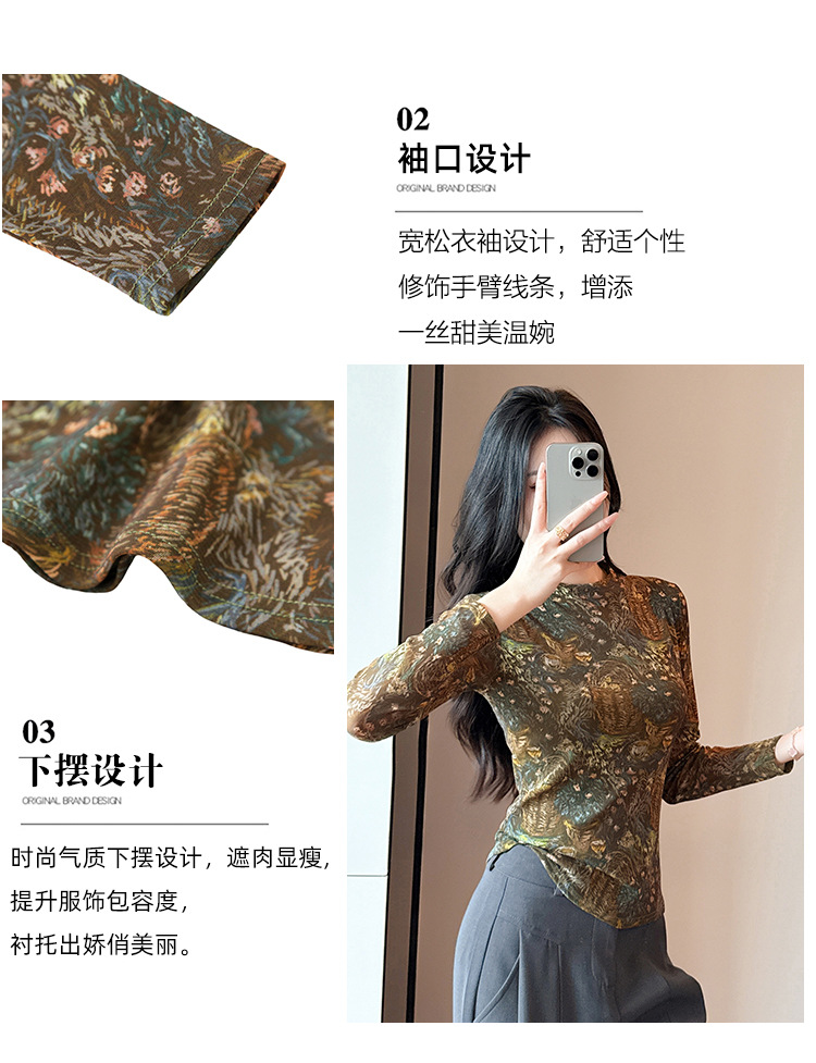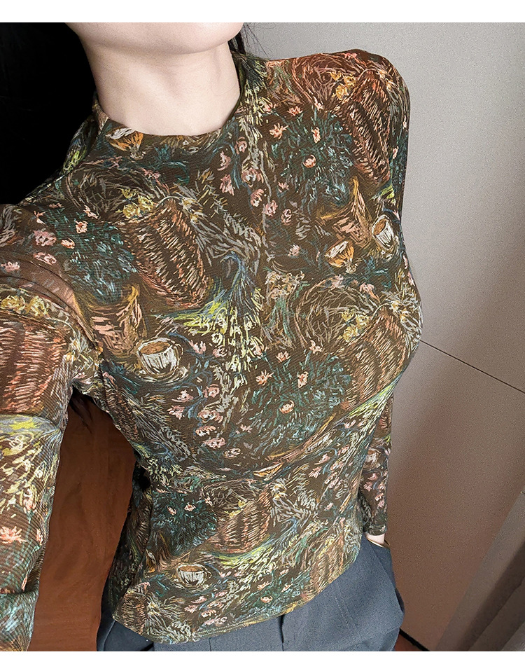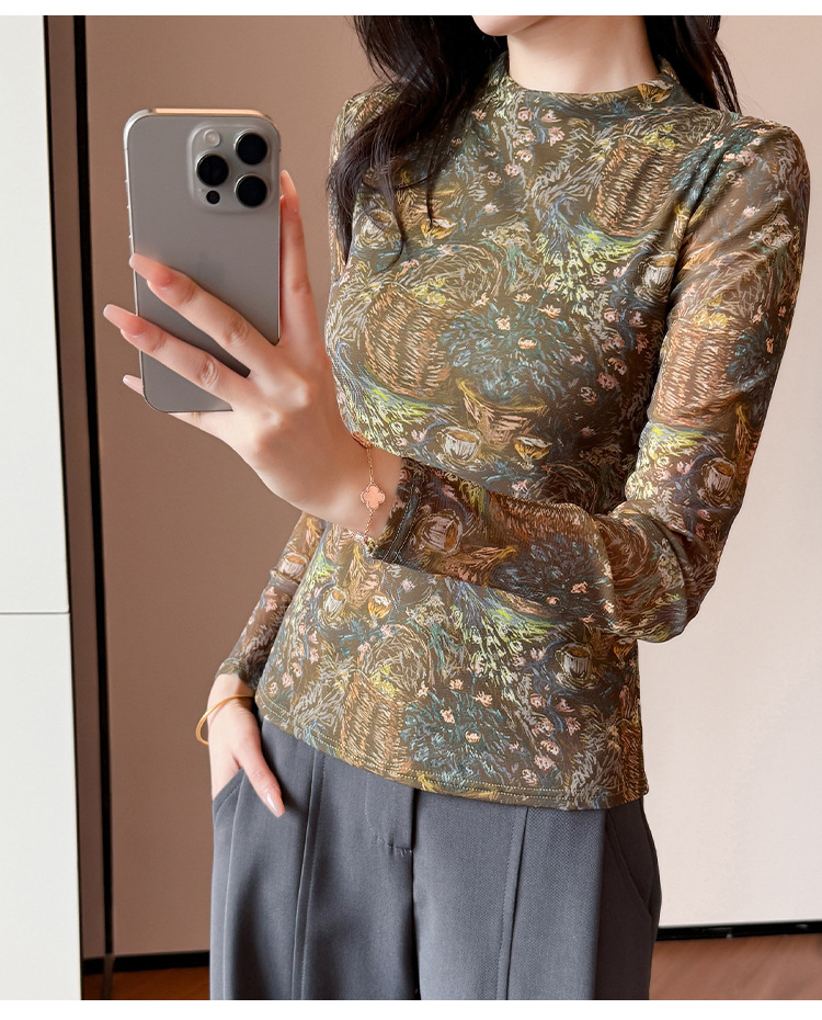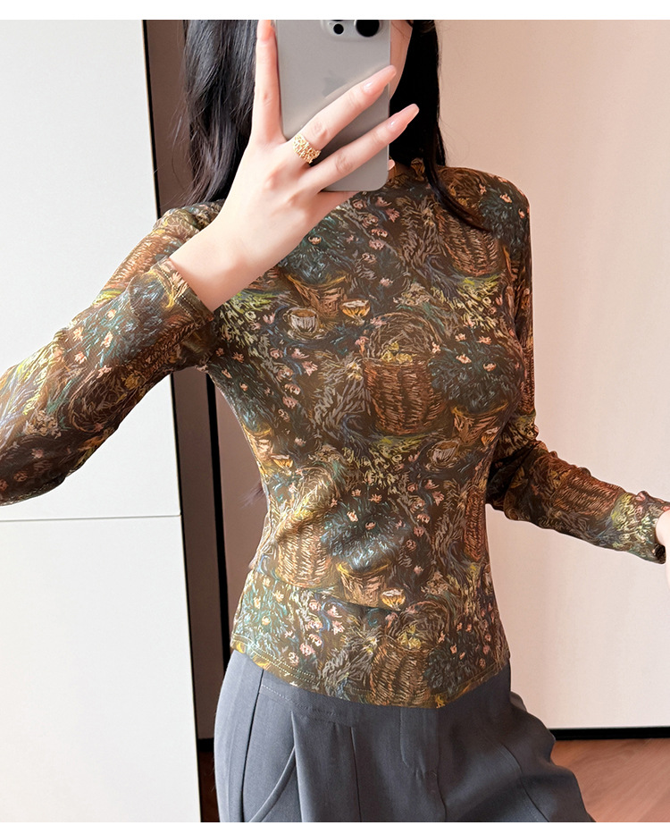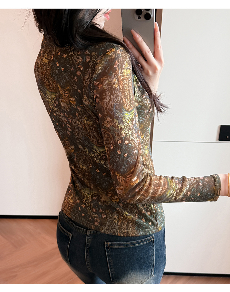 KQL A55F8717时尚洋气高弹网纱T恤长袖印花高领打底衫