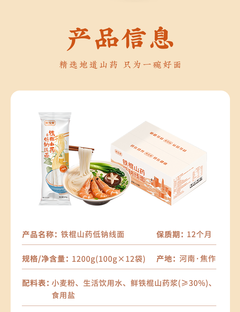 怀生堂铁棍山药低钠线面1200g/箱(100g*12袋)30%山药粉添加,温和养胃,好消化 纯天然配料:小麦粉+山药+水+盐