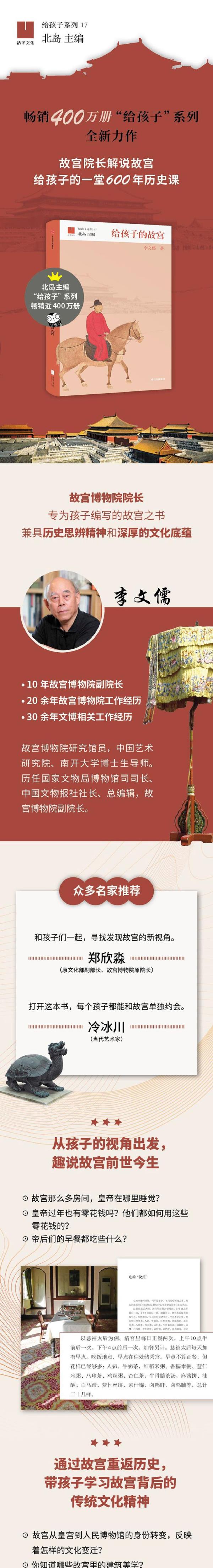 畅销400万册的“给孩子系列”新书——《给孩子的故宫》来啦!故宫博物院院长带孩子逛故宫,涨知识,感受故宫600年积淀出的历史底蕴。