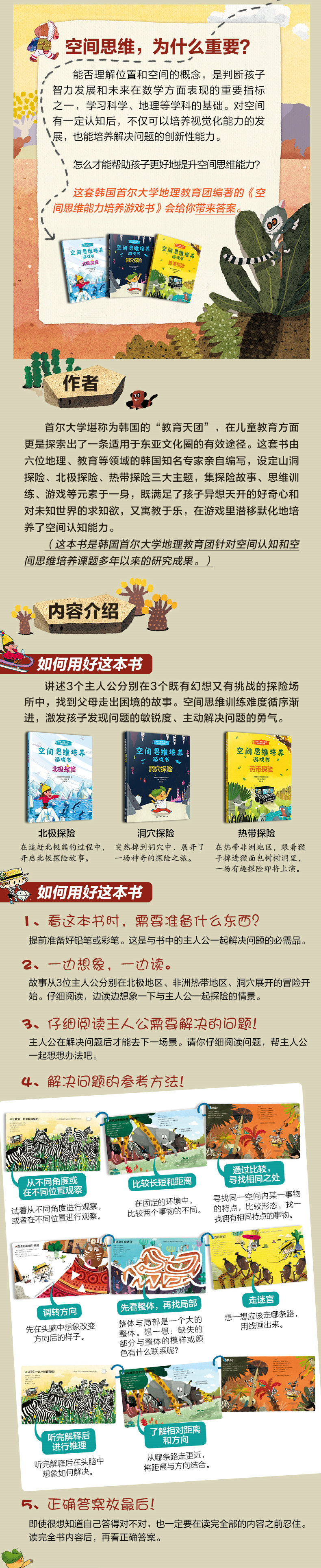 儿童空间思维养成绘本”是一套专为儿童打造的空间思维训练书,这套书根据4-8岁儿童的年龄特点和认知水平,结合当前新的儿童思维训练研究成果与流行的亲子旅行文化,延请首尔大学地理教育研究团队进行编写、韩国著名插画师进行绘制。本册《北极探险》向读者展示了白雪皑皑的北极风光及有趣的北极探险活动,在有趣、刺激的活动中融入了思维训练游戏,好玩儿有趣,又能锻炼读者思维。文中精美有趣的插画能吸引孩子的目光,增强孩子的审美。这套书既可以用来亲子阅读,儿童也可以自主阅读。