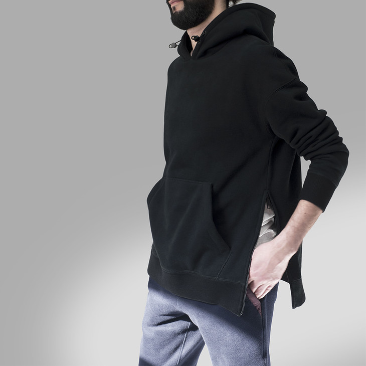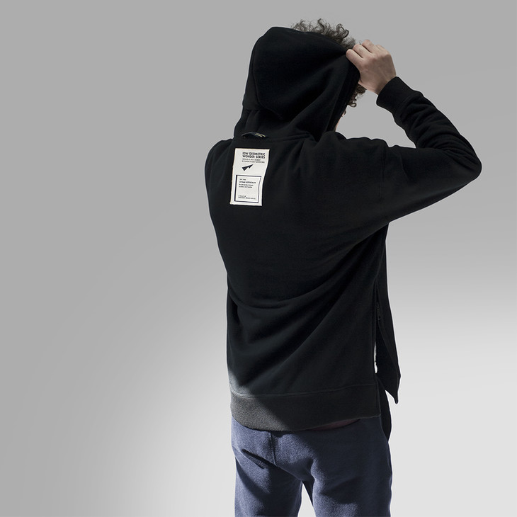 黑色长袖毛圈布帽衫,兜帽沿配有拉绳,专为寒冷和多风天气设计。腰部设计有袋鼠式口袋,方便取用且空间宽敞。衣服侧边配有拉链,罗纹袖口和下,摆适用于各种尺码,方便调整。背颈接缝处有品牌标志性的平等丝带和复古帆布标签细节,突显了系列的独特性。