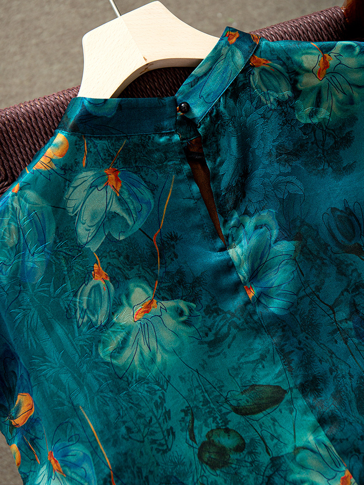 丁摩 真丝香云纱立领旗袍连衣裙女国风刺绣100桑蚕丝收腰裙子夏5ZF-52060