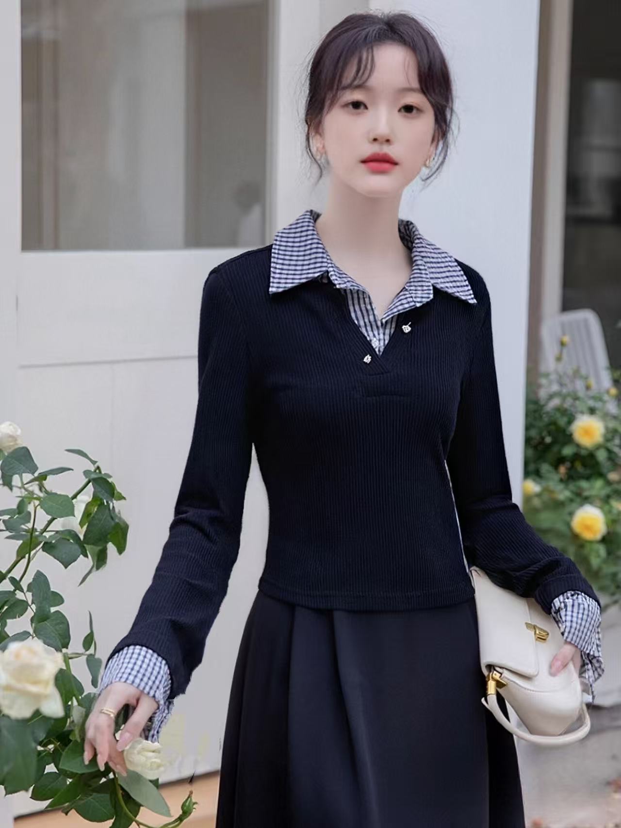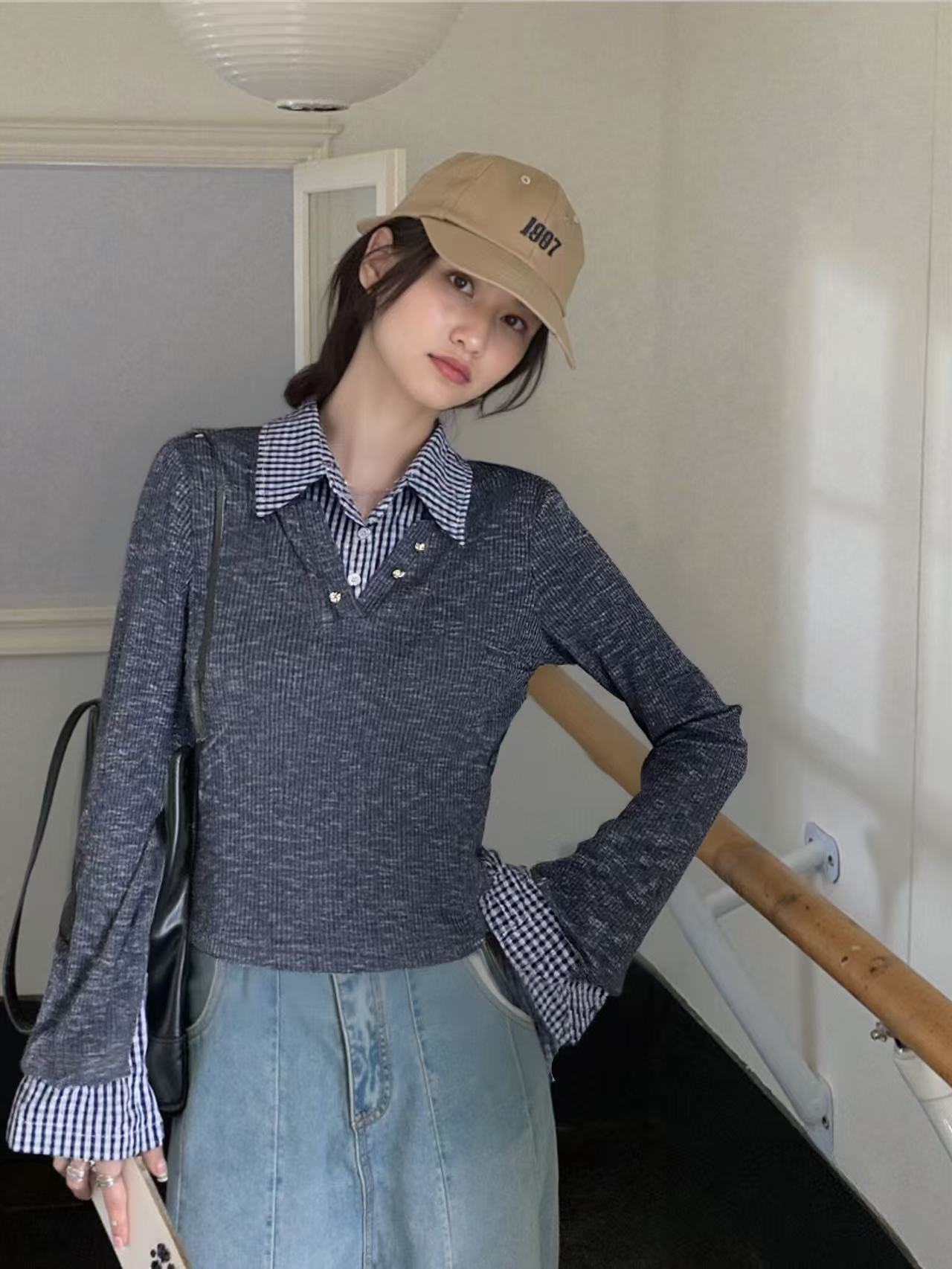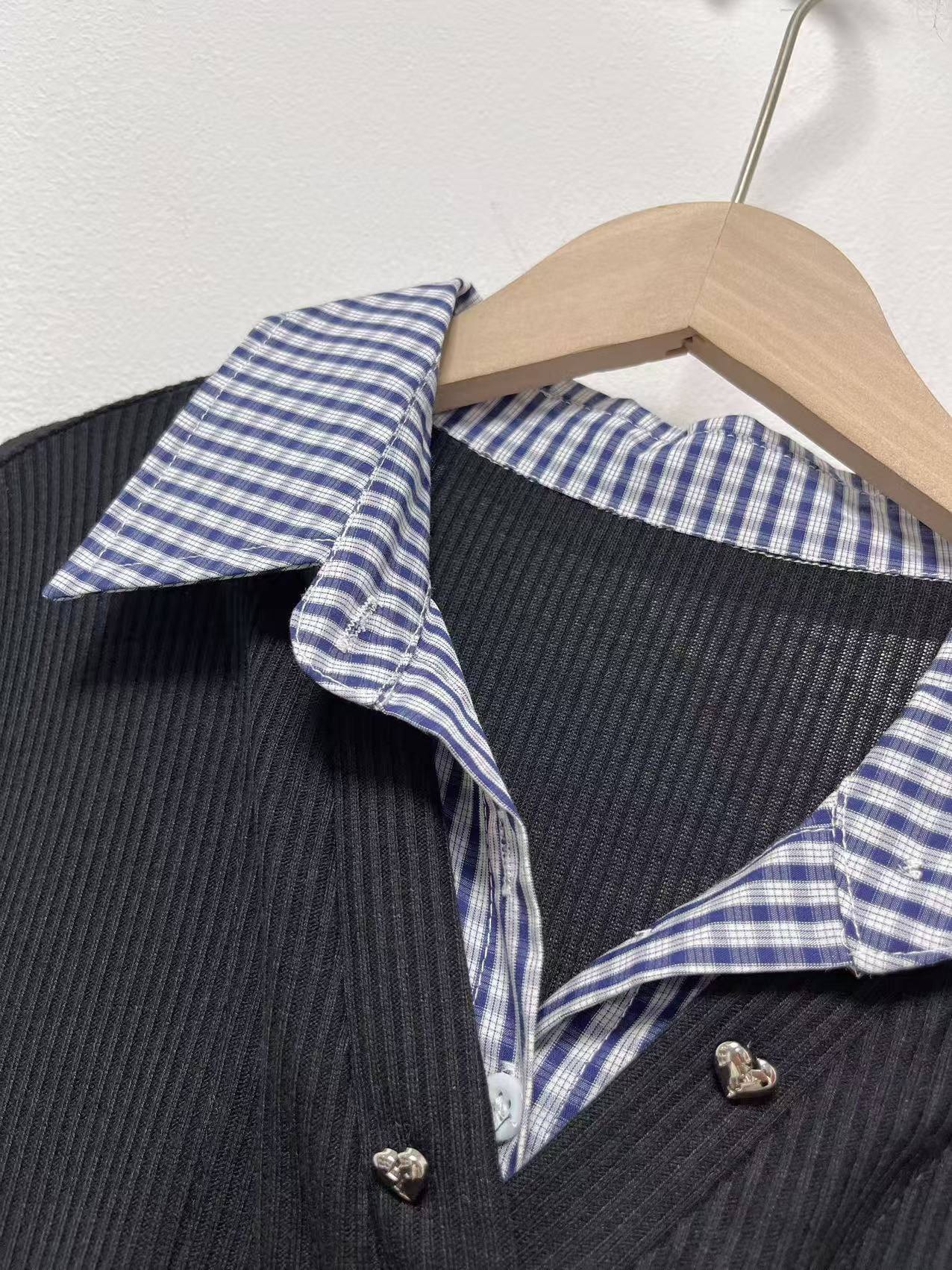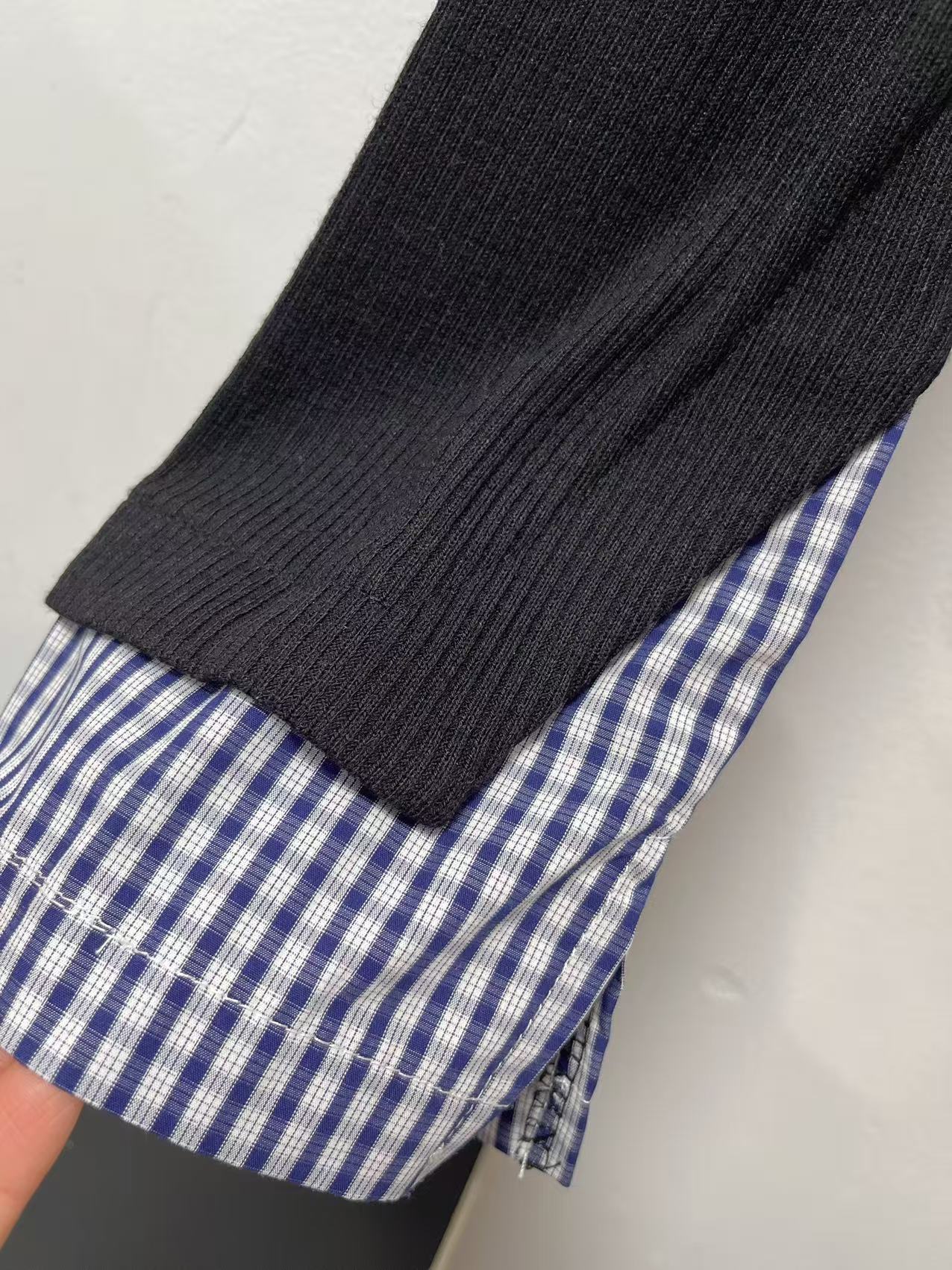 【清仓价】不参与退换 -8803假两件拼格子短款小衫-喜出