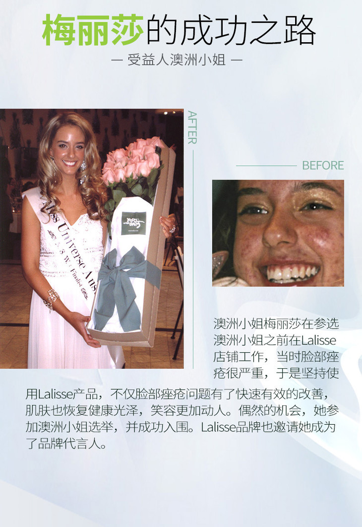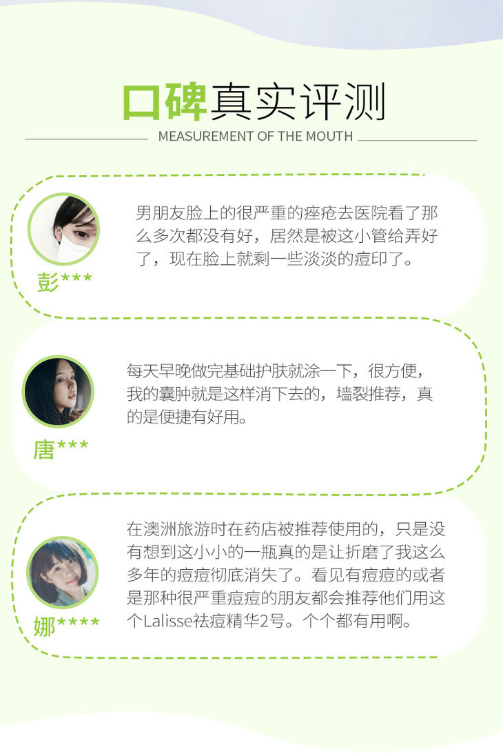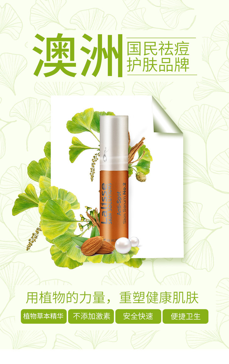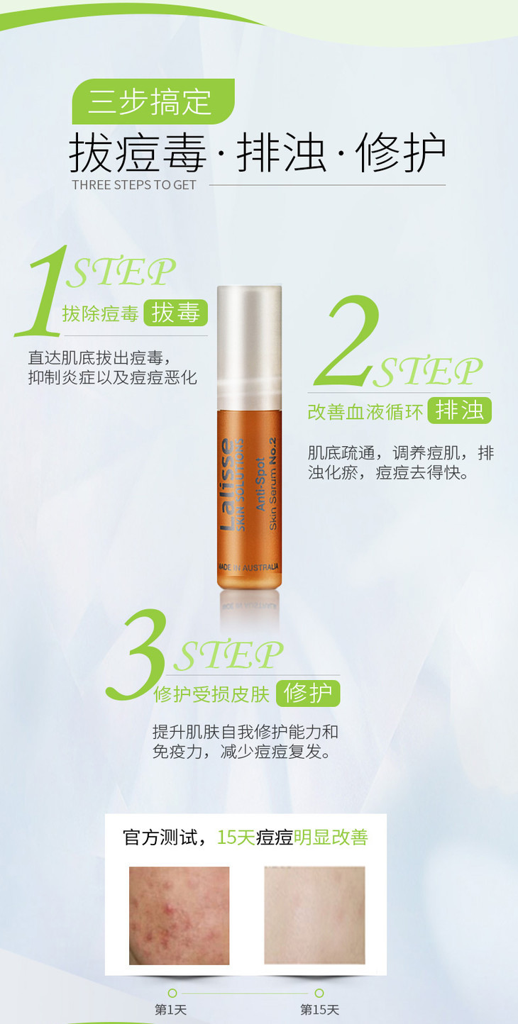 Lalisse是澳洲本土品牌,采用前沿技术创新研发,帮助解决各类问题肌肤。他家的这款植物祛痘精华1号温和,2号急救,适合所有痘痘,都有比较浓烈的中药味,这两款配合在一起用效果更好,先用2号精华,效果更强效一些,能让红肿爆发的大痘痘快速收干,消炎,再用1号祛痘精华温和巩固,不让它发复发不留痘印,这个祛痘精华套装效果真的很猛烈,没有水杨酸,刚敷上凉凉的,2秒以后开始刺痛,就像薄荷风油精一样,越凉越疼,疼的同时就觉得痘痘在收干,变小,它含有的天然的草本精华,更具有杀菌的功效。
