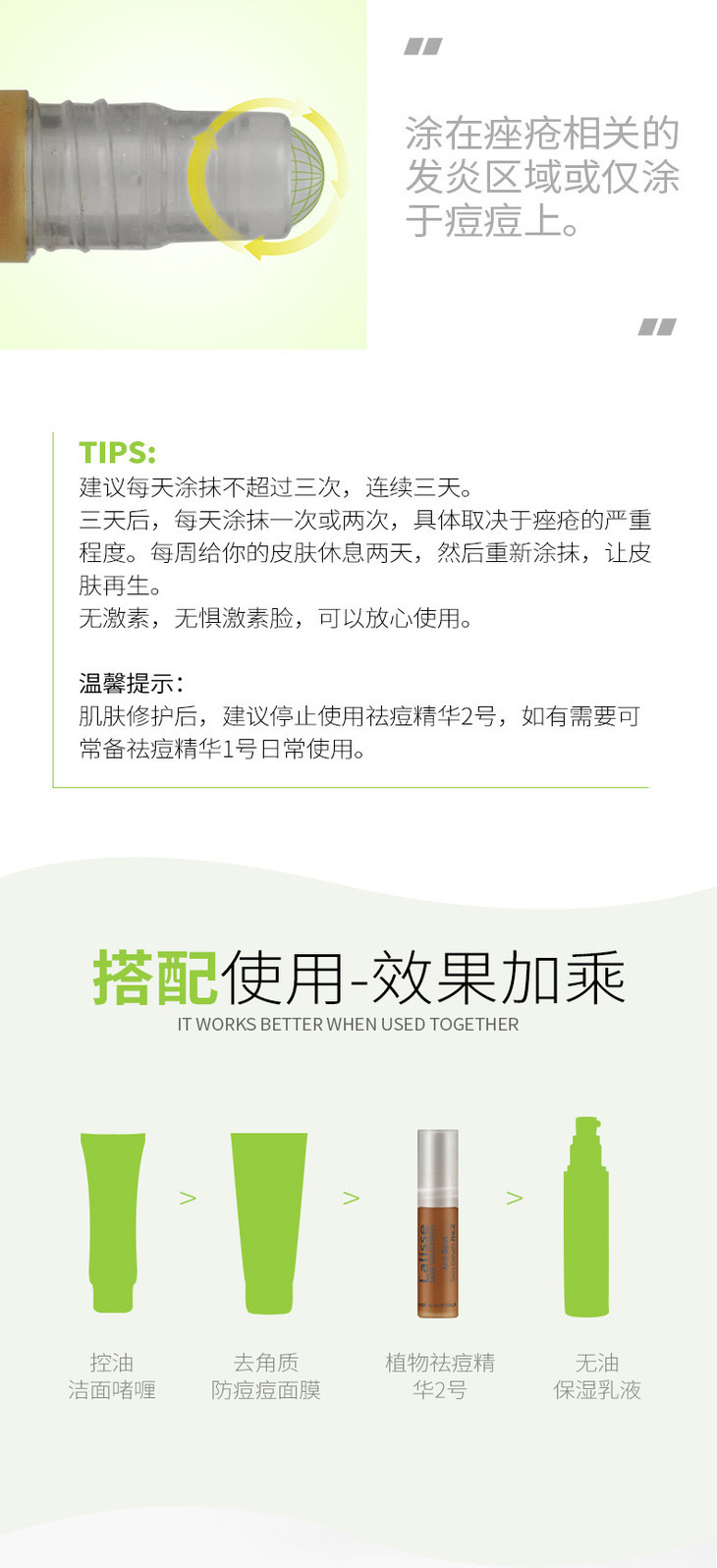 温馨提示:肌肤状况缓解后,建议停用2号祛痘精华,可以更换1号精华作为日常使用哦~