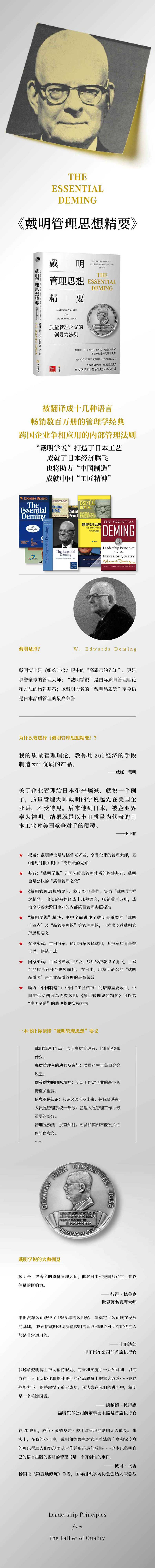 ★ 《戴明管理思想精要》:戴明典著作,集成“戴明学说”之精华。出版后被翻译成十几种语言,畅销数百万册,成为全球各大跨国企业的内部质量管理参照标准