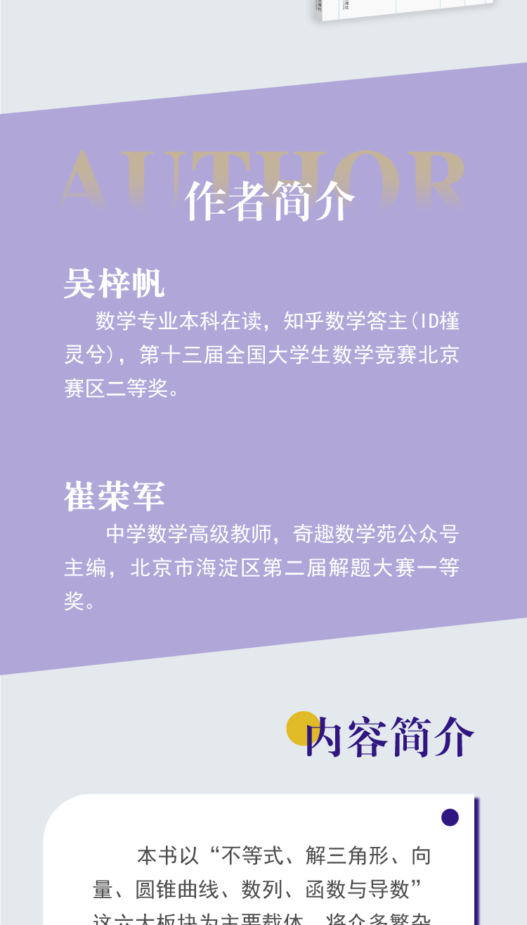 吴梓帆,数学专业本科在读,北京市大学生数学竞赛二等奖,知乎数学答主ID槿灵兮,粉丝数9.4w+ 。崔荣军,高级教师,奇趣数学苑公众号主编,北京市海淀区第一届解题大赛一等奖。
