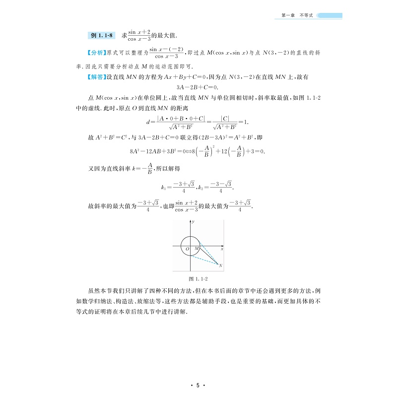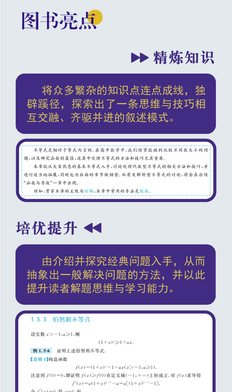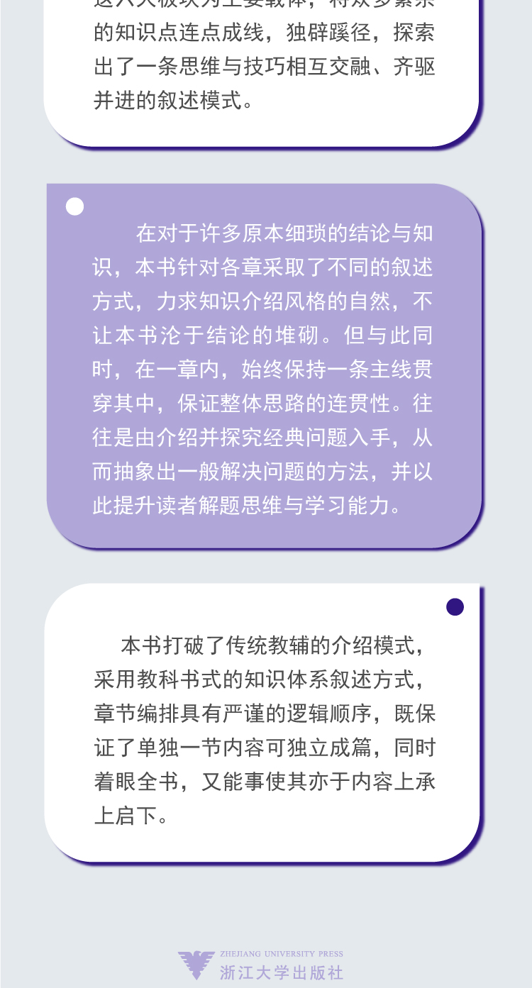本书以“不等式、解三角形、向量、圆锥曲线、数列、函数与导数”这六大板块为主要载体,将众多繁杂的知识点连点成线,独辟蹊径,探索出了一条思维与技巧相互交融、齐驱并进的叙述模式。在对于许多原本细琐的结论与知识,本书针对各章采取了不同的叙述方式,力求知识介绍风格的自然,不让本书沦于结论的堆砌。但与此同时,在一章内,始终保持一条主线贯穿其中,保证整体思路的连贯性。往往是由介绍并探究经典问题入手,从而抽象出一般解决问题的方法,并以此提升读者解题思维与学习能力。本书打破了传统教辅的介绍模式,采用教科书式的知识体系叙述方式,章节编排具有严谨的逻辑顺序,既保证了单独一节内容可独立成篇,同时着眼全书,又能事使其亦于内容上承上启下。