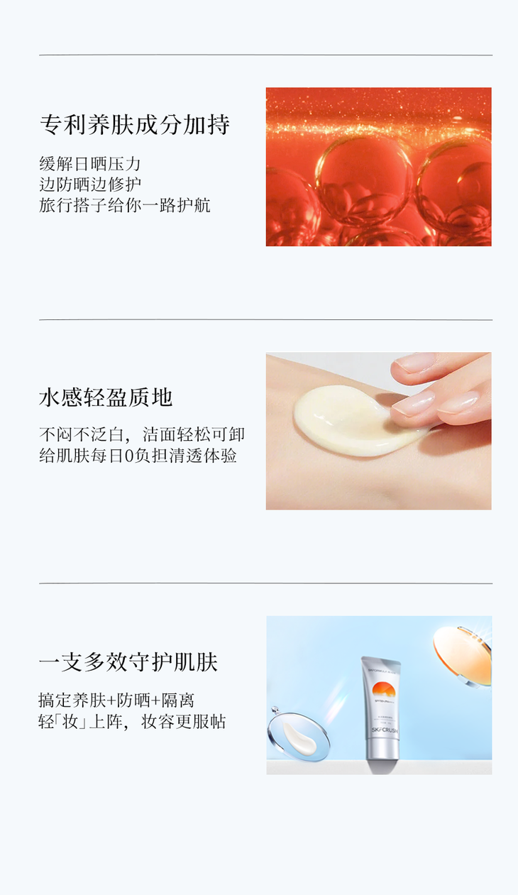 SPF50+的高倍防护,能有效阻隔UVA/UVB,防止晒黑、晒伤、晒老。一瓶=高倍防晒+隔离+养肤精华,帮你精简掉繁琐的护肤步骤。
