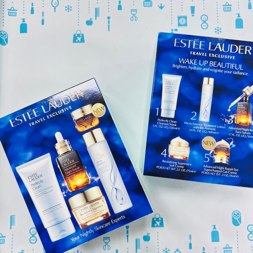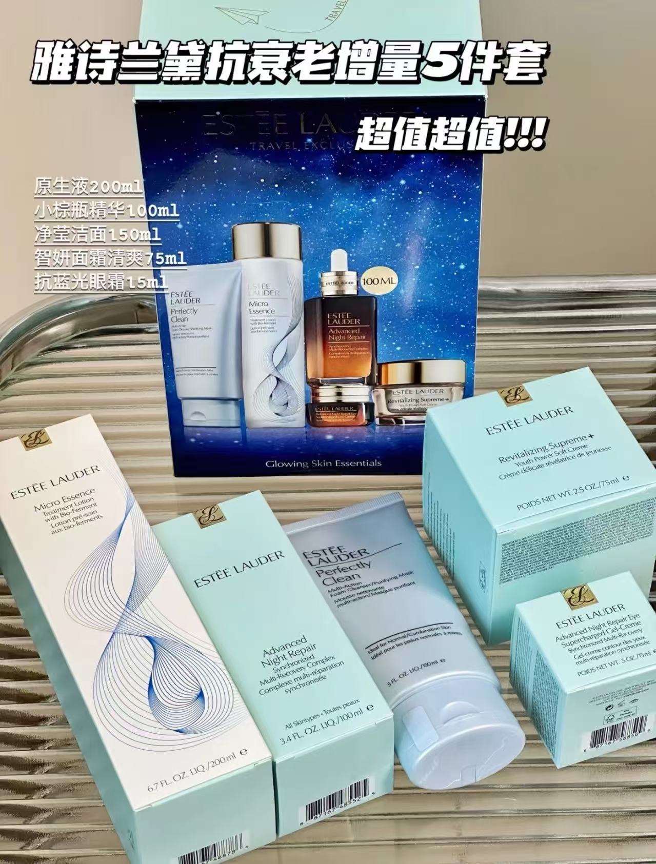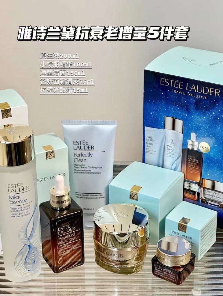 👑雅诗兰黛五件套 👍一个套盒就满足所有!雅诗兰黛热门单品💥! ✨深层修护✅,抗衰抗皱✅,弹力紧致✅,收缩毛孔✅,匀净祛黄✅。 🙌适合任何肤质~ 【套装包括】:蓝洁面150ml+小棕瓶50ml+智妍清爽面霜75ml+抗蓝光眼霜15ml+原生液100ml