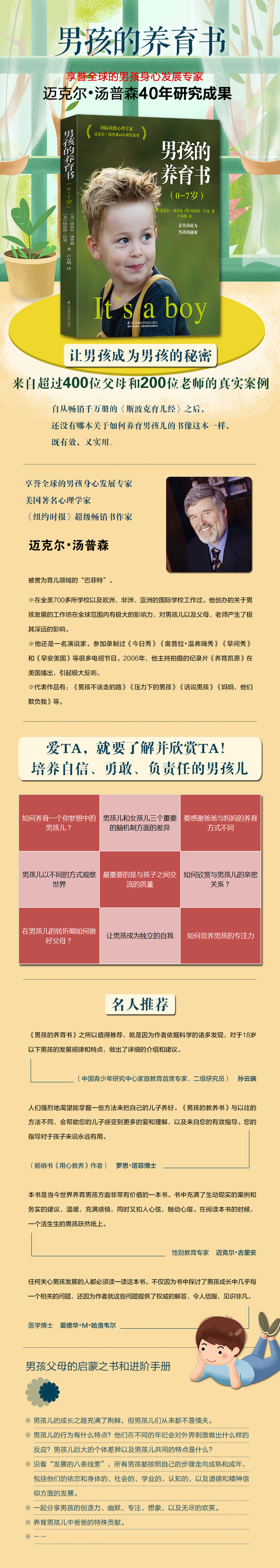 《男孩的养育书(0—7岁)》让男孩成为男孩的秘密,来自超过400位父母和200位老师的真实案例,教你深入了解从出生到学龄前每个阶段男孩成长的秘密