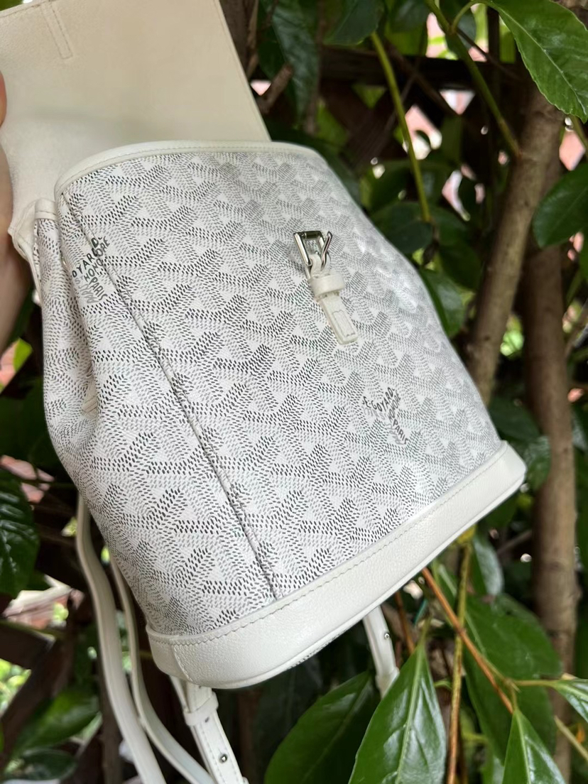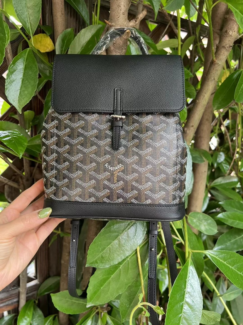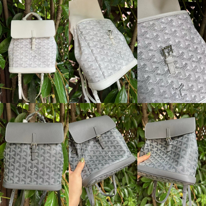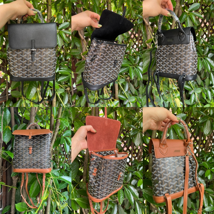 仔细看,前三张是老款,后六张是升级新款,升级新款的点在于,袋口抽绳没有了,变成两侧暗扣,暗扣打开就变成小方包的模样。此外底部变成老花材质,那么耐磨程度没得说了。翻盖的内里是同色系麂皮,好处在于翻盖内里不会变的皱巴巴