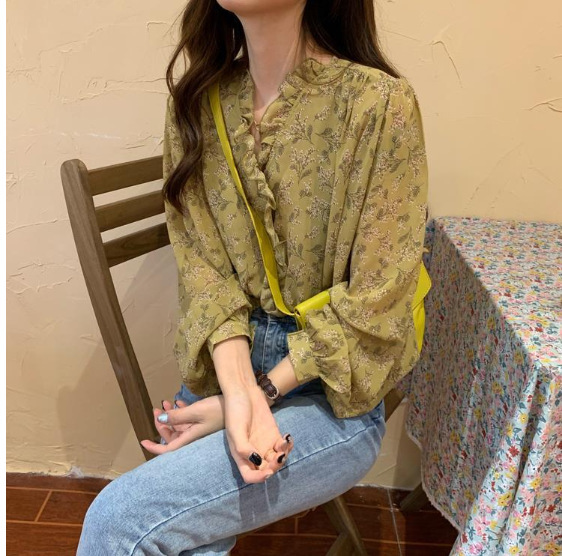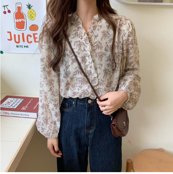 春夏新款【长袖衬衫】韩版时尚碎花雪纺衫 洋气防晒泡泡袖上衣服