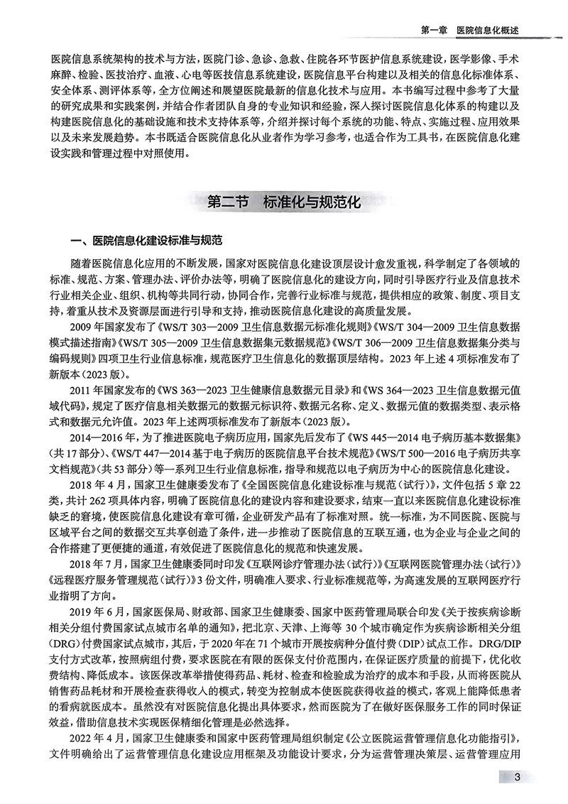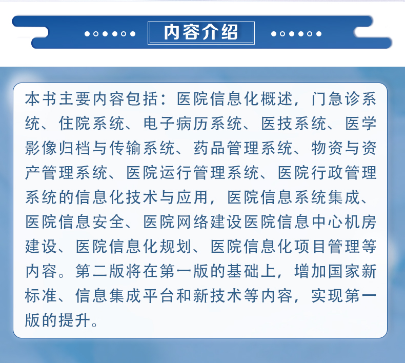 本书主要内容包括:医院信息化概述,门急诊系统、住院系统、电子病历系统、医技系统、医学影像归档与传输系统、 药品管理系统、 物资与资产管理系统、医院运行管理系统、医院行政管理系统的信息化技术与应用,医院信息系统集成、医院信息安全、医院网络建设医院信息中心机房建设、医院信息化规划、医院信息化项目管理等内容。第二版将在第一版的基础上,增加国家新标准、信息集成平台和新技术等内容,实现第一版的提升。全书基本保持第一版的整体架构,约30章,150万字以内。